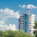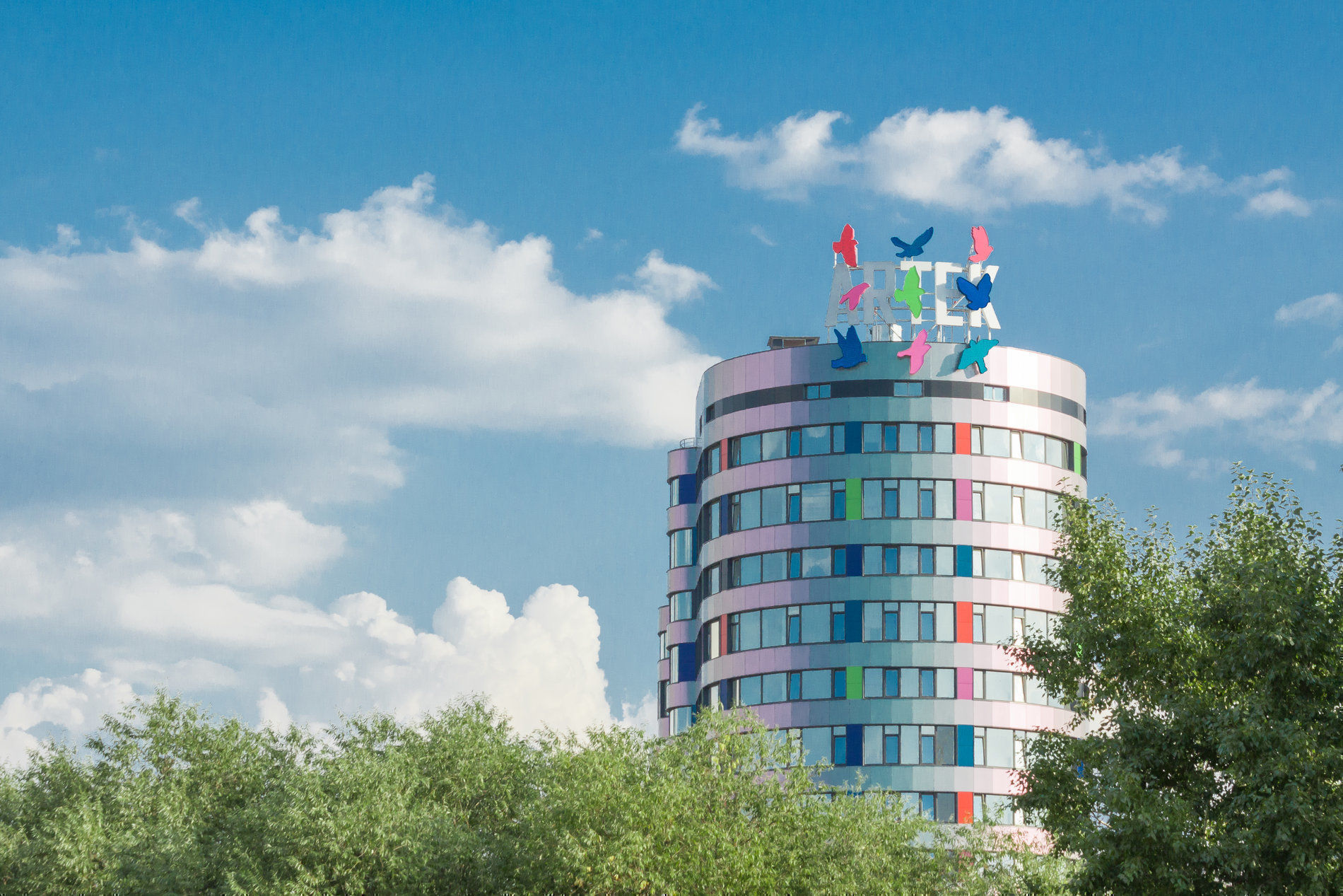 Уникальность проекта заключается в его дизайне – элементы «парящих птичек» придают проекту легкость и утонченность. Сварка фигур выполнялась из металлической полосы, вырезанной на плазменном станке, так как стандартный профиль не позволял повторить требуемый изогнутый контур. При засветке были использованы открытые RGB-светодиоды индивидуального контроля. Данная технология позволила создать эффект смены цветов, что символизирует многообразие стилевых решений, подчеркивает широту и индивидуальность самого проекта. Кроме того, важным моментом оказался выбор света торца букв. Поскольку опыт работы с крышными установками показал, что на фоне неба вывеска со светлыми торцами может потеряться, нашими дизайнерами была разработана презентация с различными вариантами засветки. Данный проект мы завершили в требуемые сроки и выполнили все пожелания Заказчика, сейчас город украшает необычная и яркая вывеска.