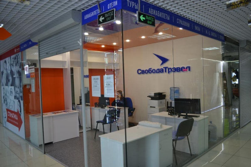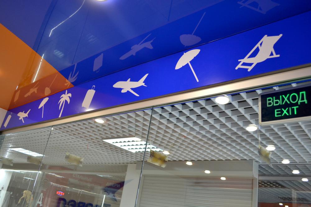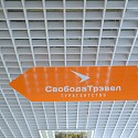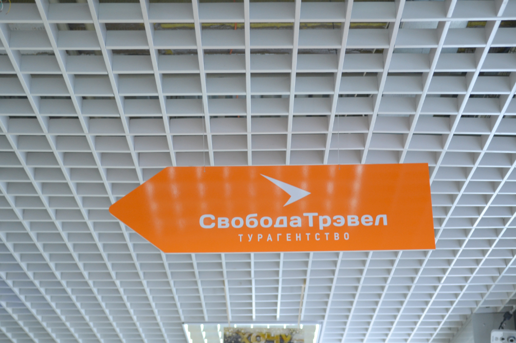 Интерьерная вывеска, навигация, декоративные накладки под потолком офиса "Свобода Трэвел".