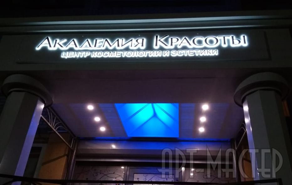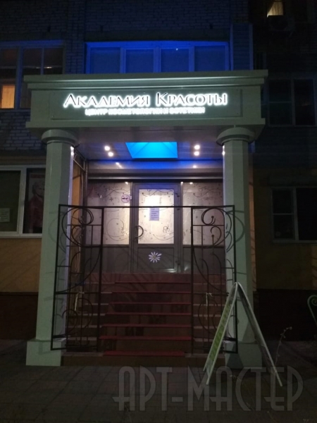 Световая вывеска выполнена по технике инкрустации на композитной основе. Удачно реализовав задумку оформления композиции, мы спроектировали и изготовили конструкцию с колонами и световой потолок. Получилась индивидуальная статусная входная группа.