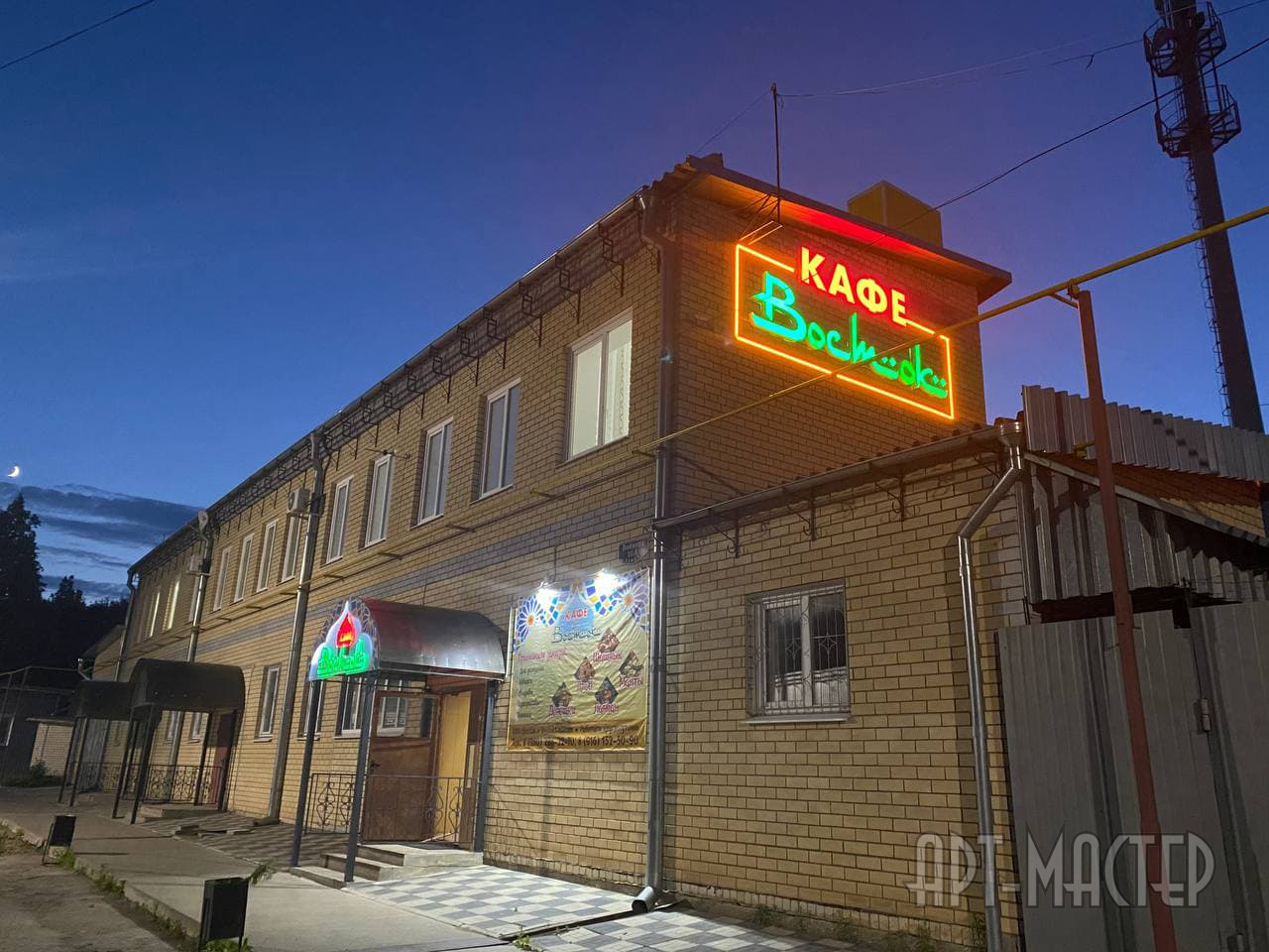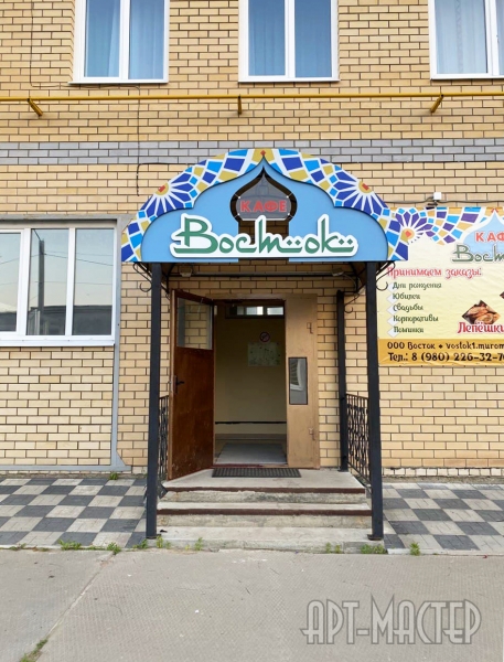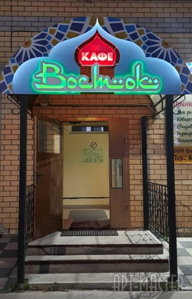 Вывеска над входом оформлена в восточном стиле с применением эксклюзивной техники, разработанной нашей компанией. Ультратонкая световая вывеска Восток, толщиной всего 9 мм! Также выполнена комбинация подсветки и цветовое оформление, гармонично отображающее красоту восточных мотивов.)