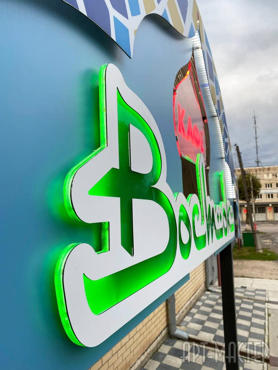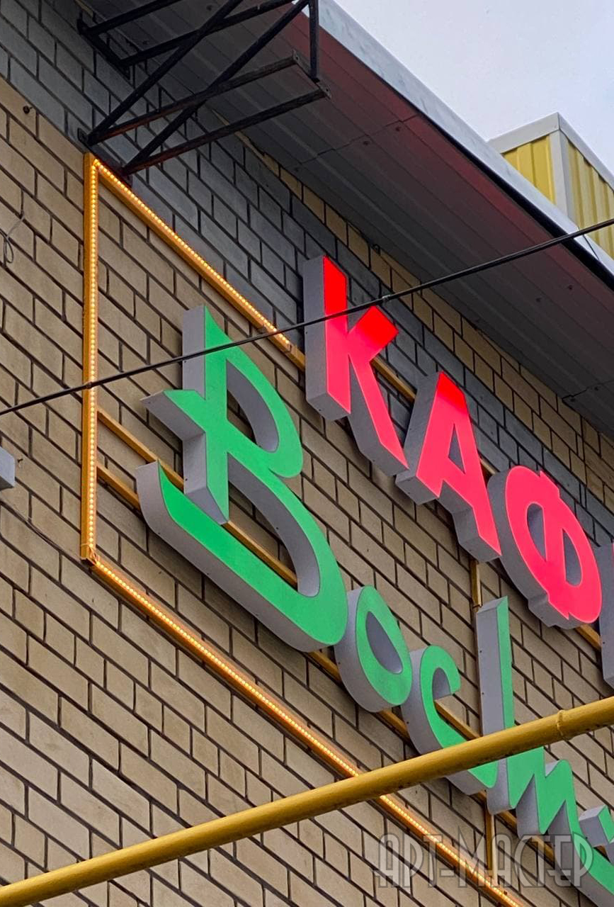 Еще одна информативная вывеска с торца здания – классические объемные буквы с лицевой засветкой, на основании из рамы. Рама кстати тоже светиться!