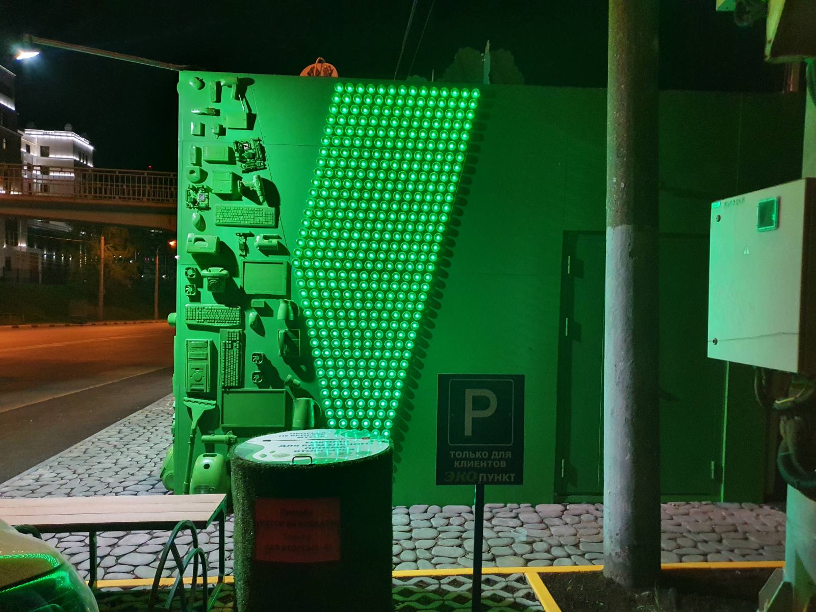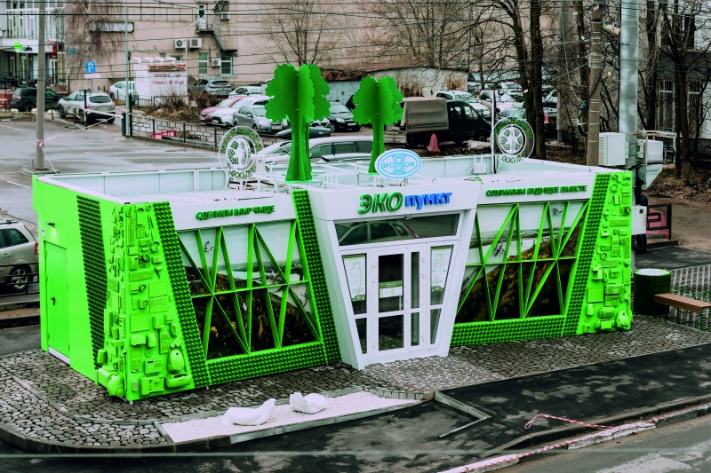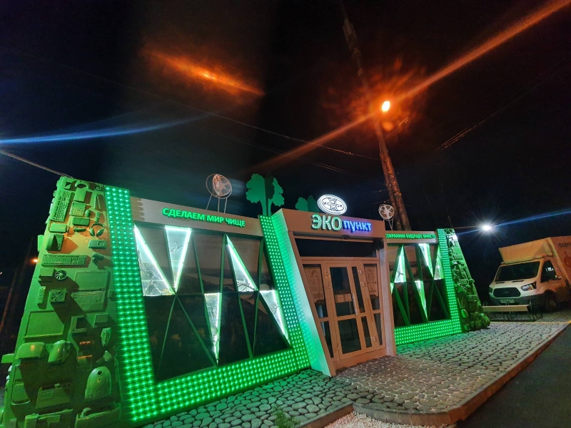 Эко-пункт является подарком горожанам на 800-летия Нижнего Новгорода. Главное отличие нового павильона в том, что он изначально задумывался и реализовывался, как арт-объект. Для его отделки и частичного оснащения использовалось вторсырье - старые элементы техники, бутылки из которых использовали донышки и другие предметы, сданные на переработку.Так, например, нижегородцы, сдавшие свою старую технику, могли увидеть ее в качестве украшения фасада. Подсветка запрограммирована на несколько сценариев под разные события и праздники. Внутри эко-пункта также была создана целая композиция из стекла, пластика и элементов старой техники