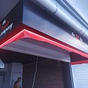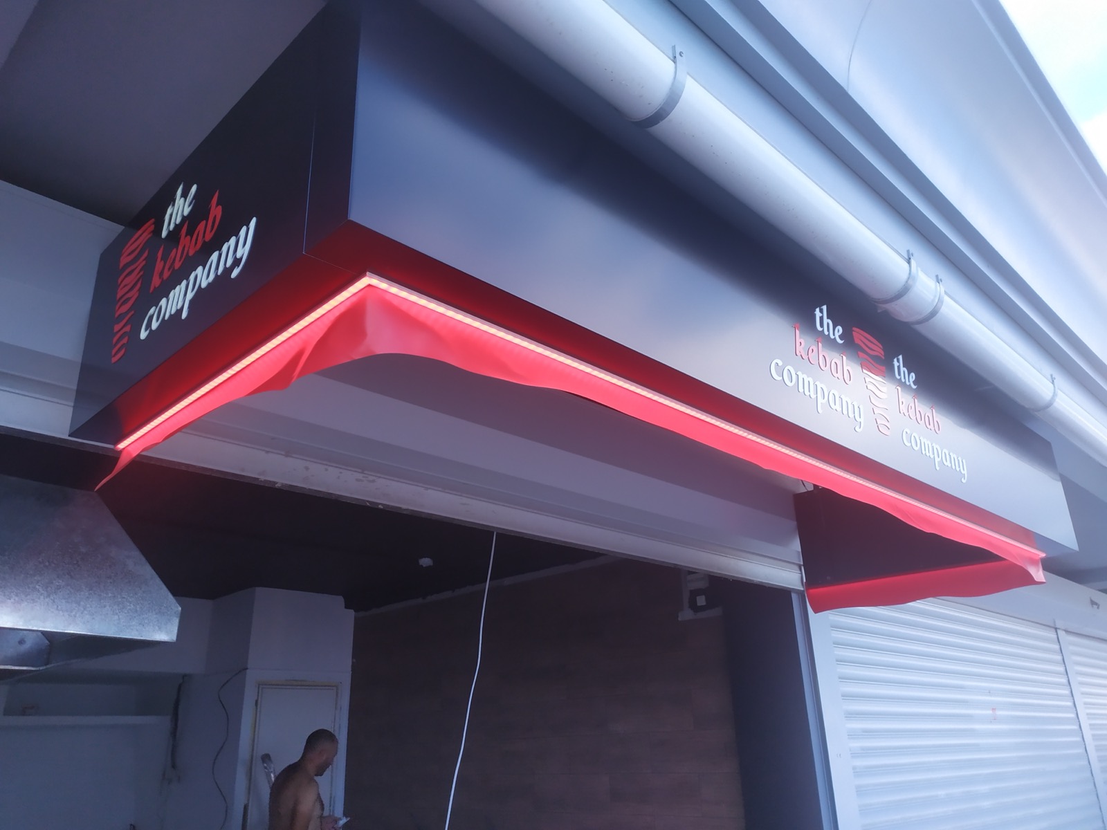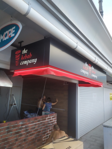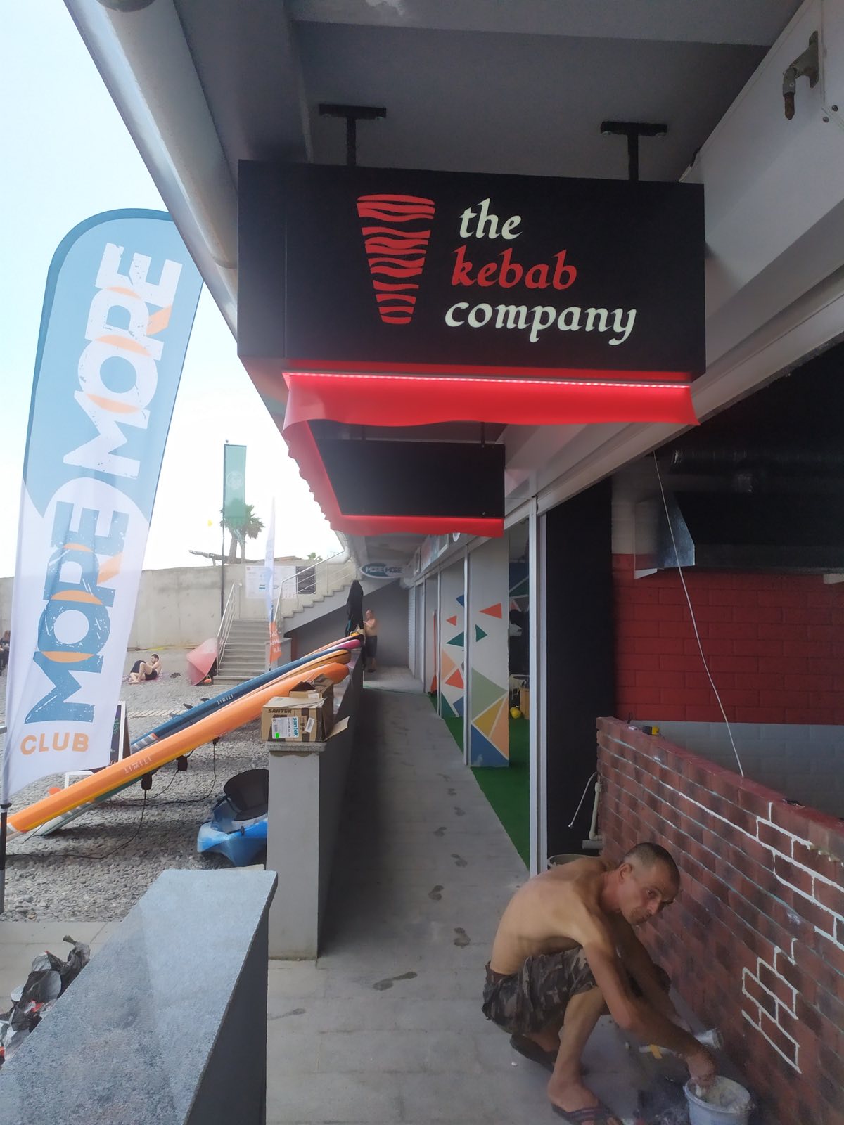 Имитация козырька с маркизом, металлокаркас, обшитый композитом с инкрустацией, снизу красная светодиодная лента с рассеивателем , светящая на красный тент, вырезанный рюшками. Вывеска привлекающая клиентов со всех сторон пляжа.