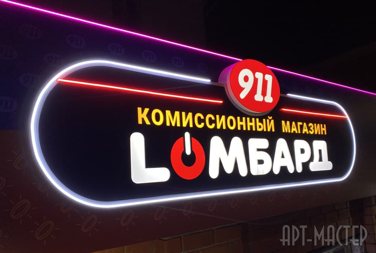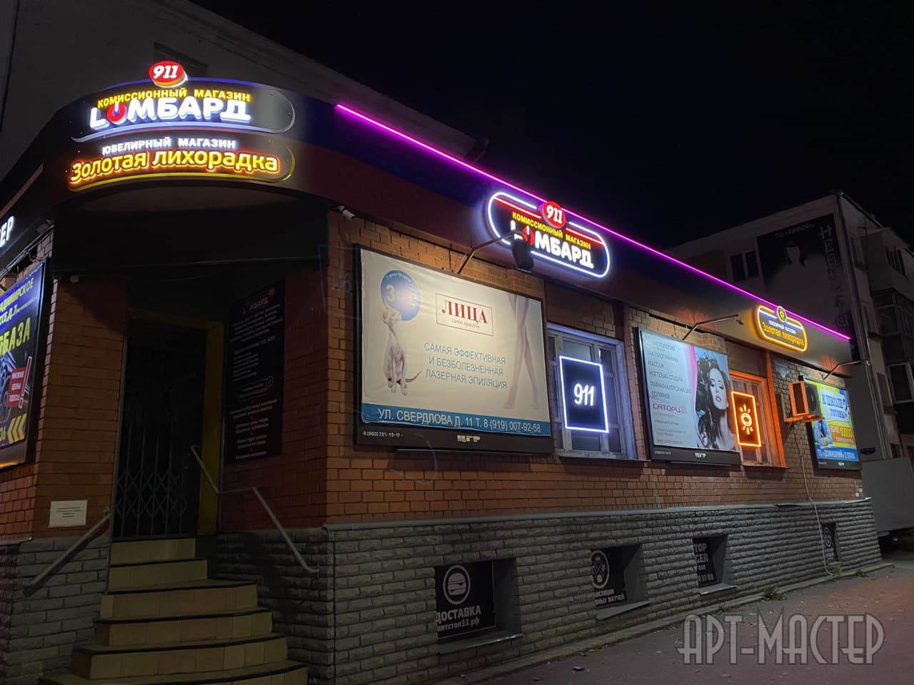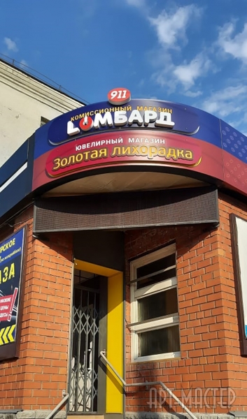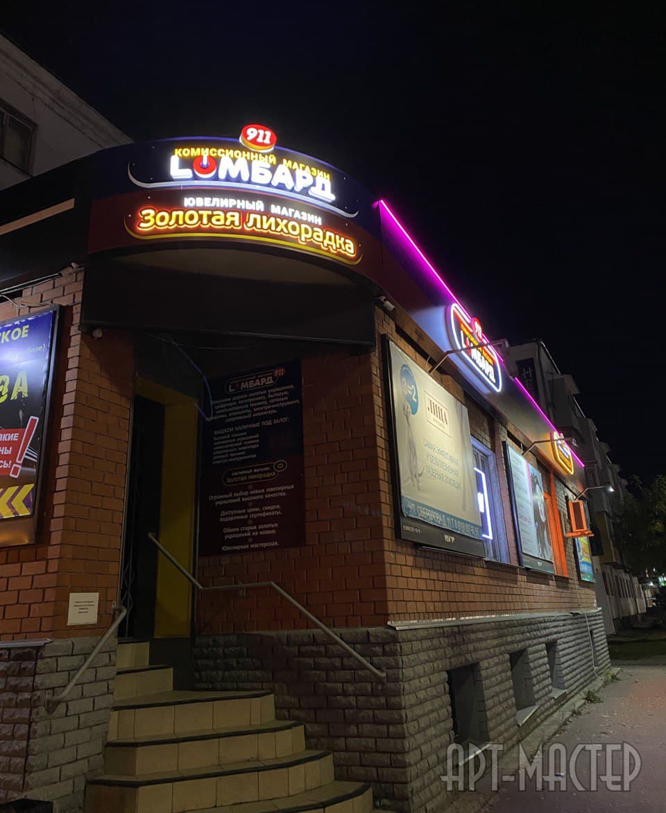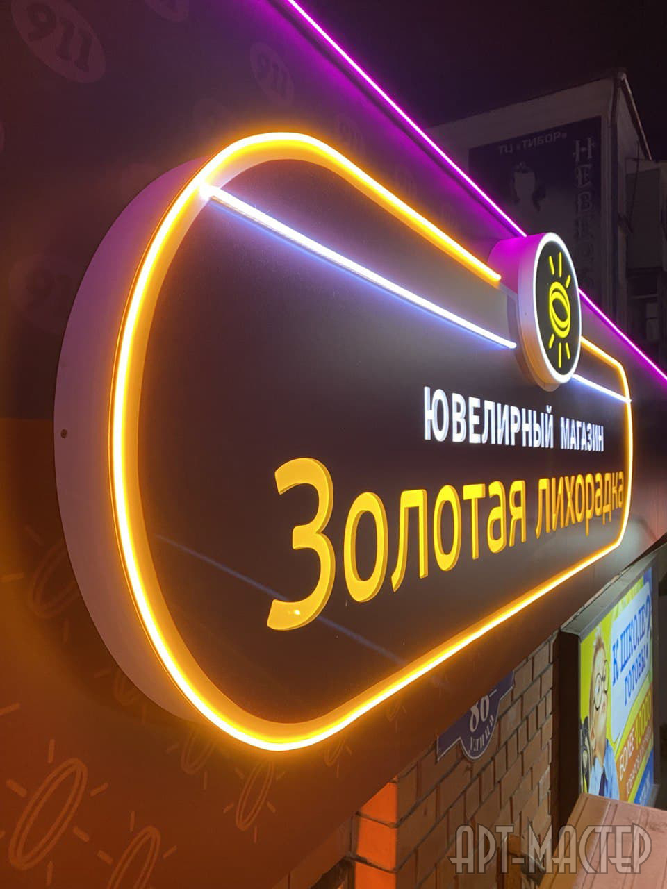 Ультратонкая световая вывеска Золотая лихорадка выполнена по нашей авторской технике. Вывеска для ломбарда- классические объемные буквы, инкрустация и световой короб.