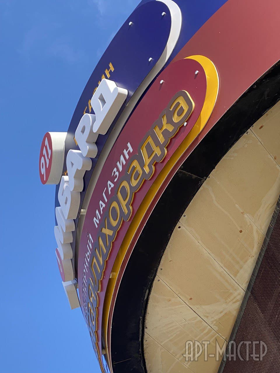 В нашем проекте выполнено удачное сочетание вывесок для двух торговых точек в одном здании.