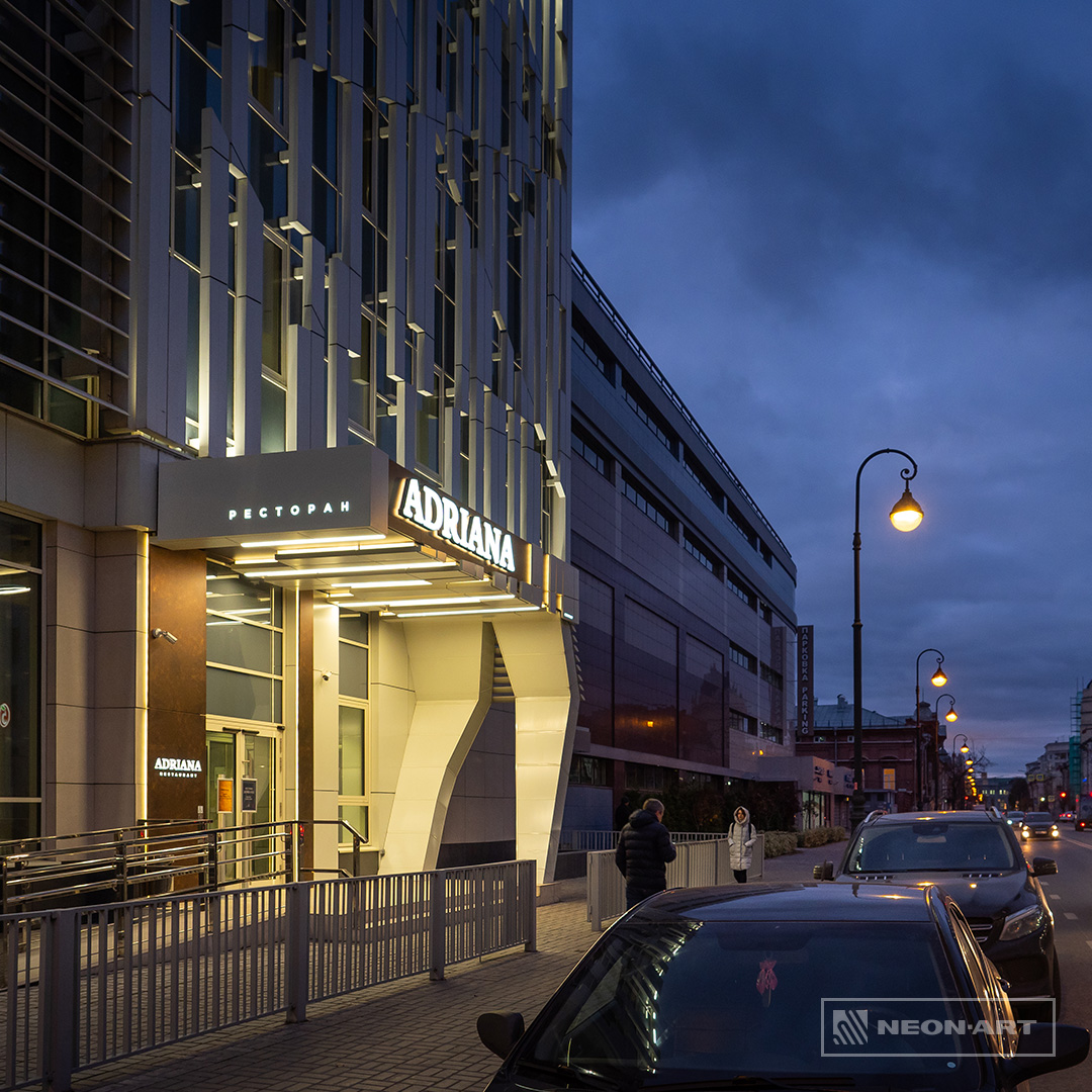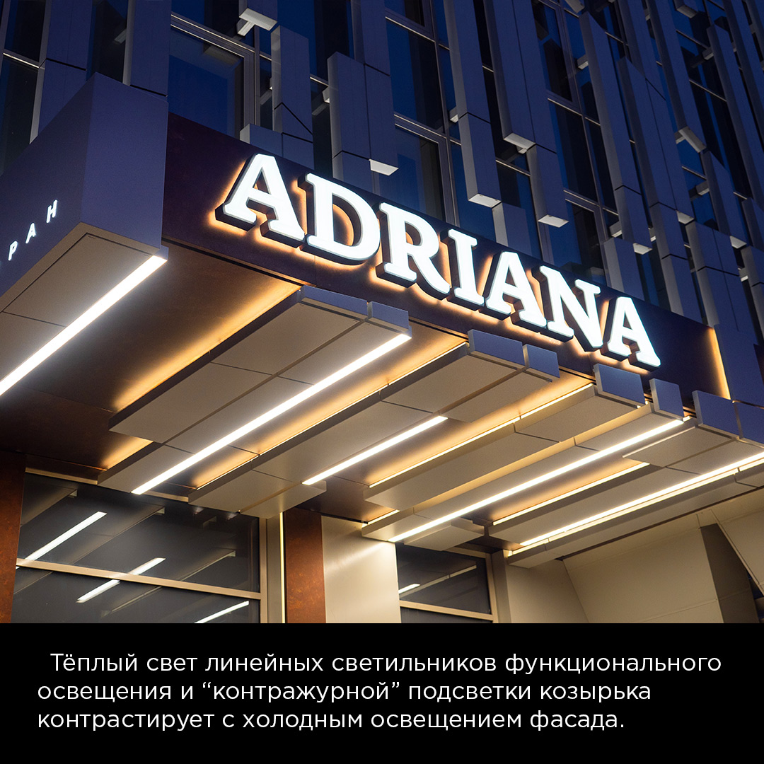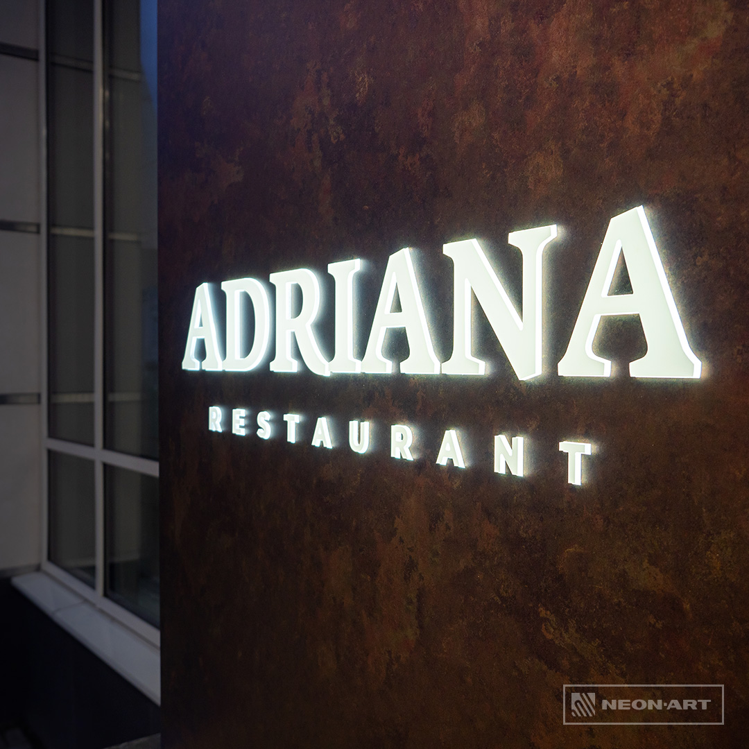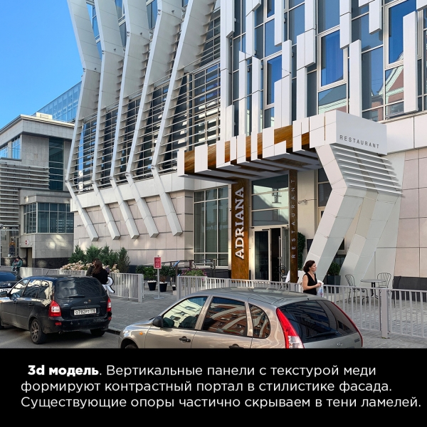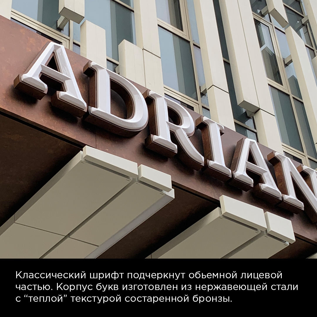 Вход выделен и визуально увеличен порталом из вертикальных панелей с текстурой состаренной бронзы. На уровне взгляда инкрустированы буквы ADRIANA из акрилового стекла 10 мм с внутренней подсветкой.