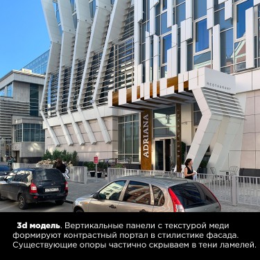 Основным элементом, привлекающим внимание, становится брутальный козырек, высотой более 5-ти метров. Совместив геометрию фасада с теплой текстурой состаренной бронзы, взятой из интерьера ресторана, создали оригинальный паттерн для козырька. Важное значение приобретает обшивка потолка, которая активно просматривается даже с противоположной стороны улицы.