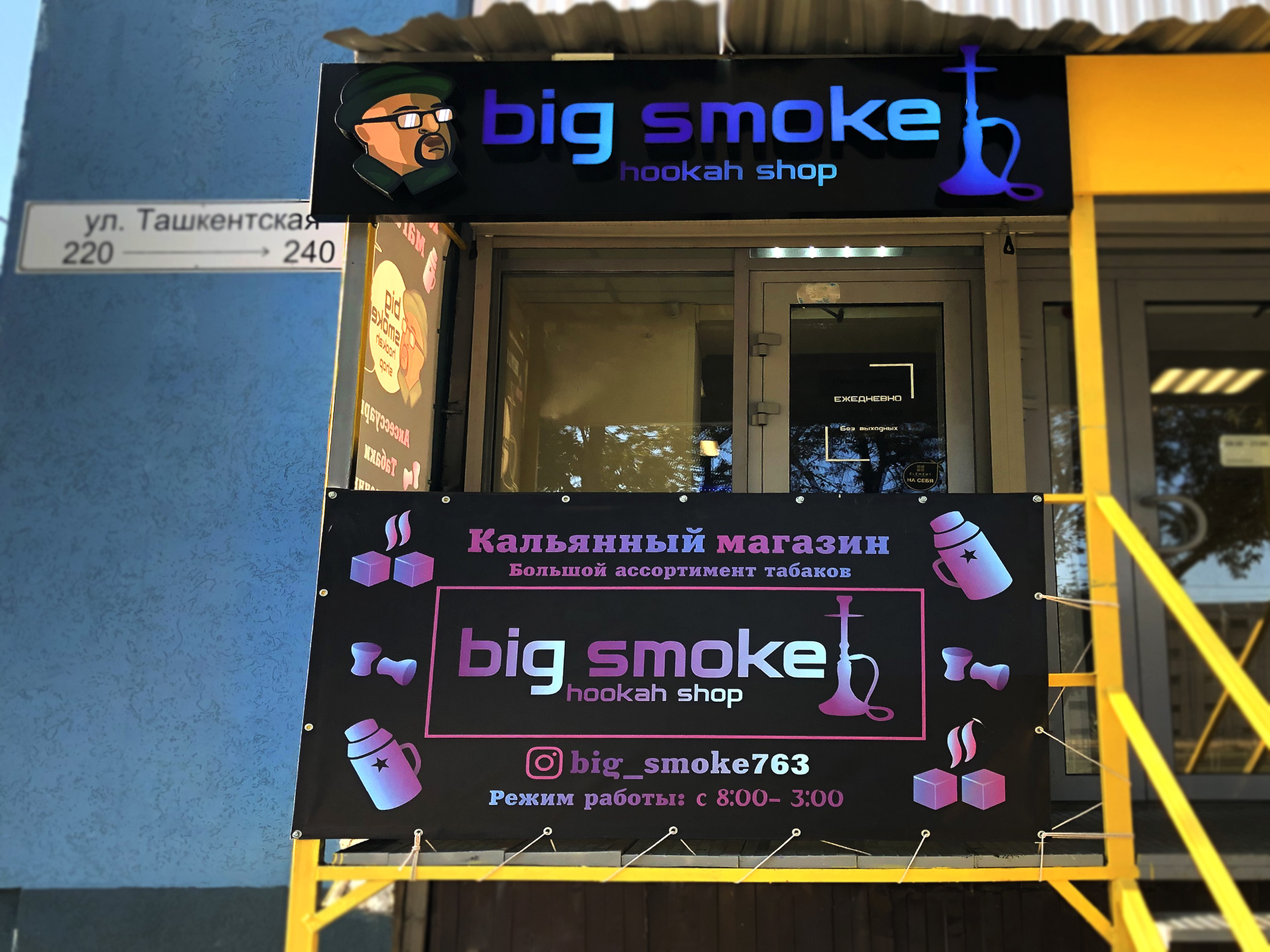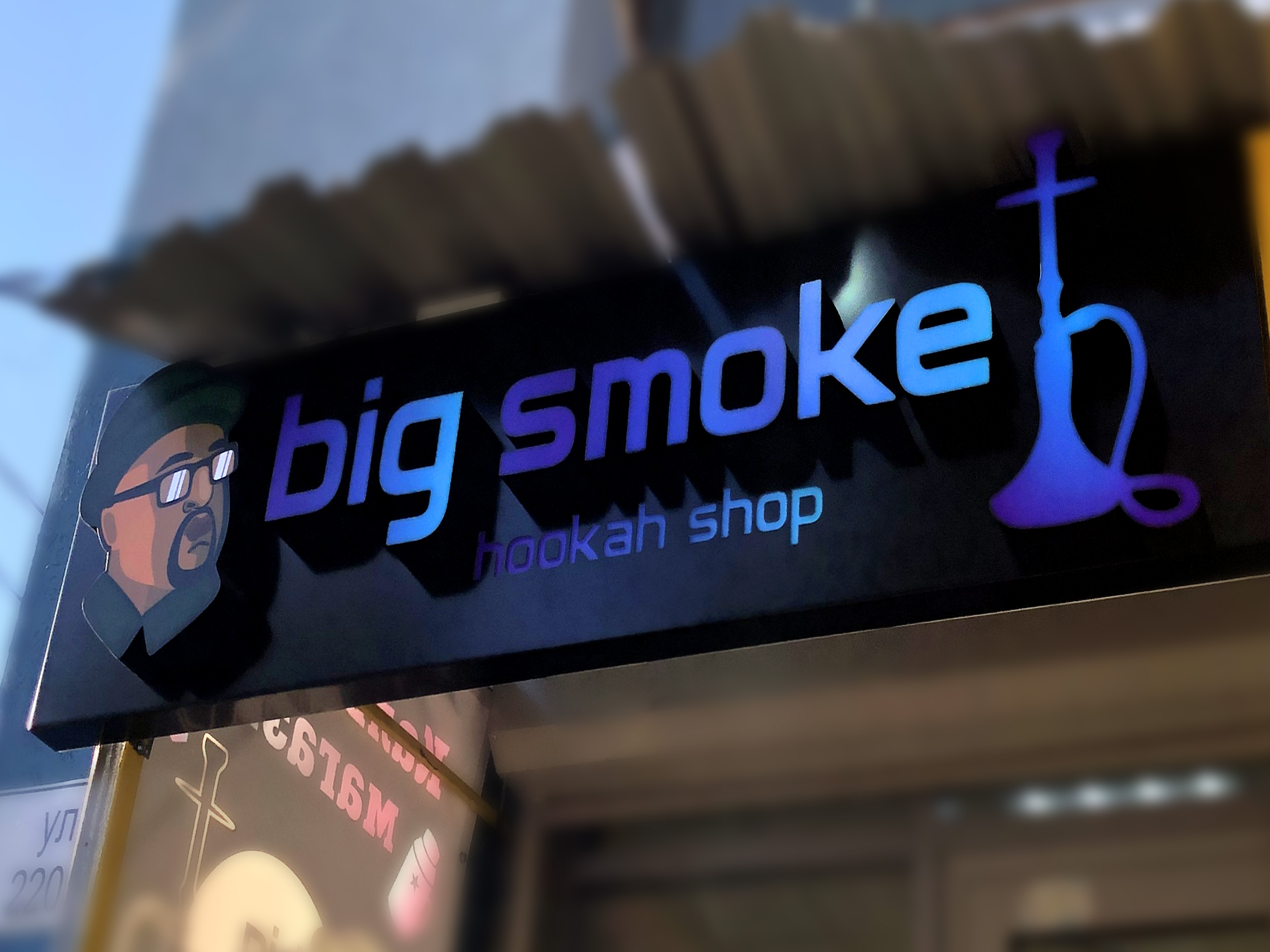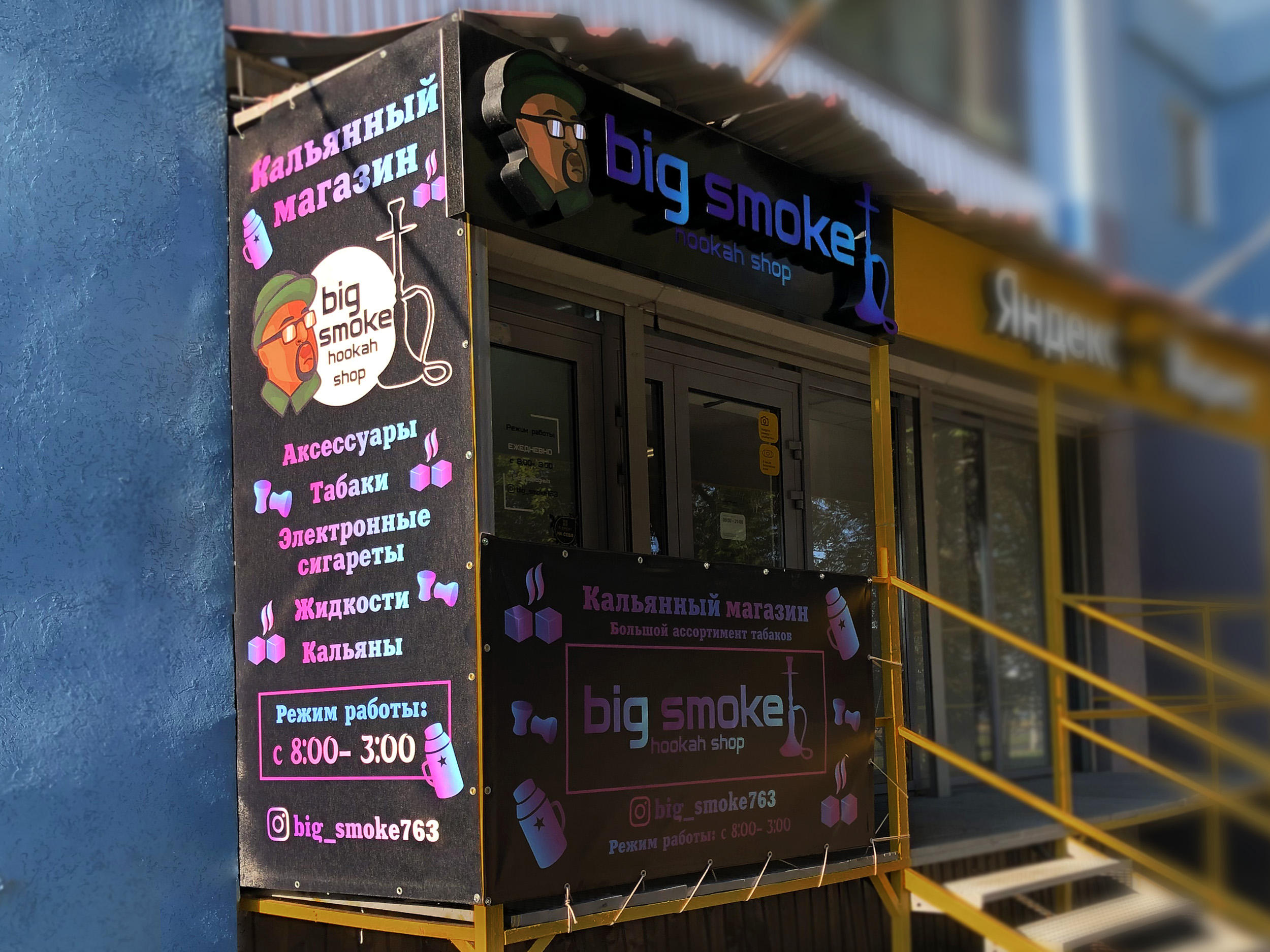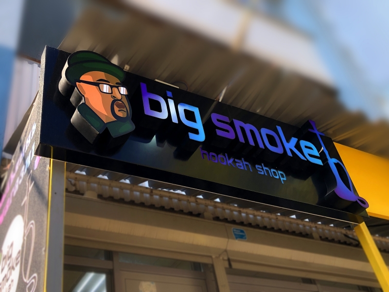 От отдела дизайна ПАРУС для магазина табачных изделий Big Smoke hookah shop была спроектирована наружная световая вывеска. Было выбрано ее наиболее подходящее исполнение, а именно объемные буквы на подложке. Яркий дизайн с дополнительными объемными элементами очень выгодно преподносит заведение, украшая и преображая фасад здания в целом. Также для заказчика был изготовлен и смонтирован на крыльце долговечный наружный баннер.