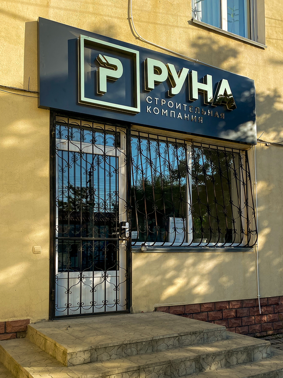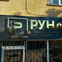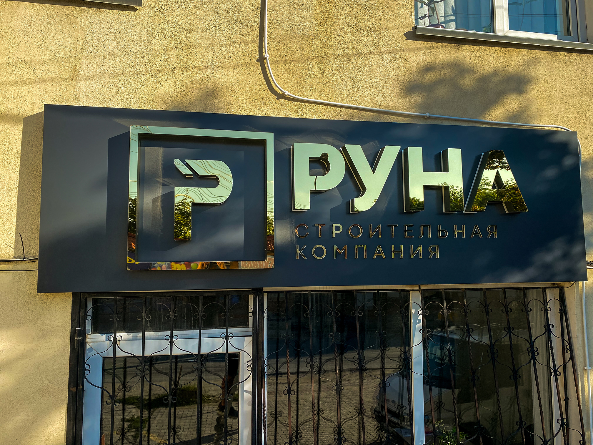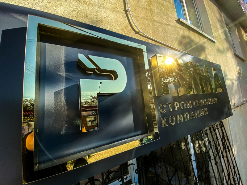 Изготовление и монтаж вывески из АКП с объемными буквами из ПВХ и зеркального золотого акрила с контражурной подсветкой.