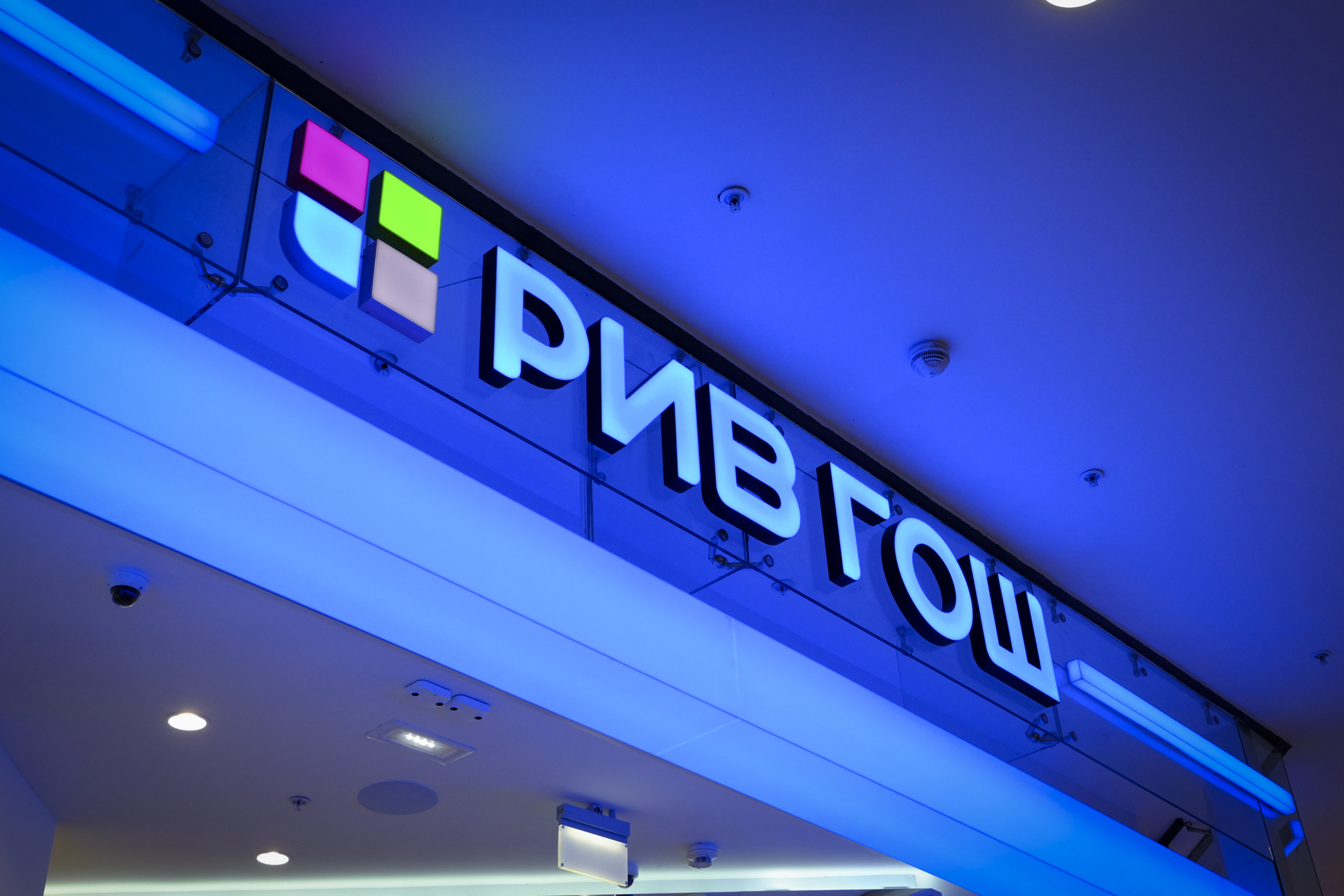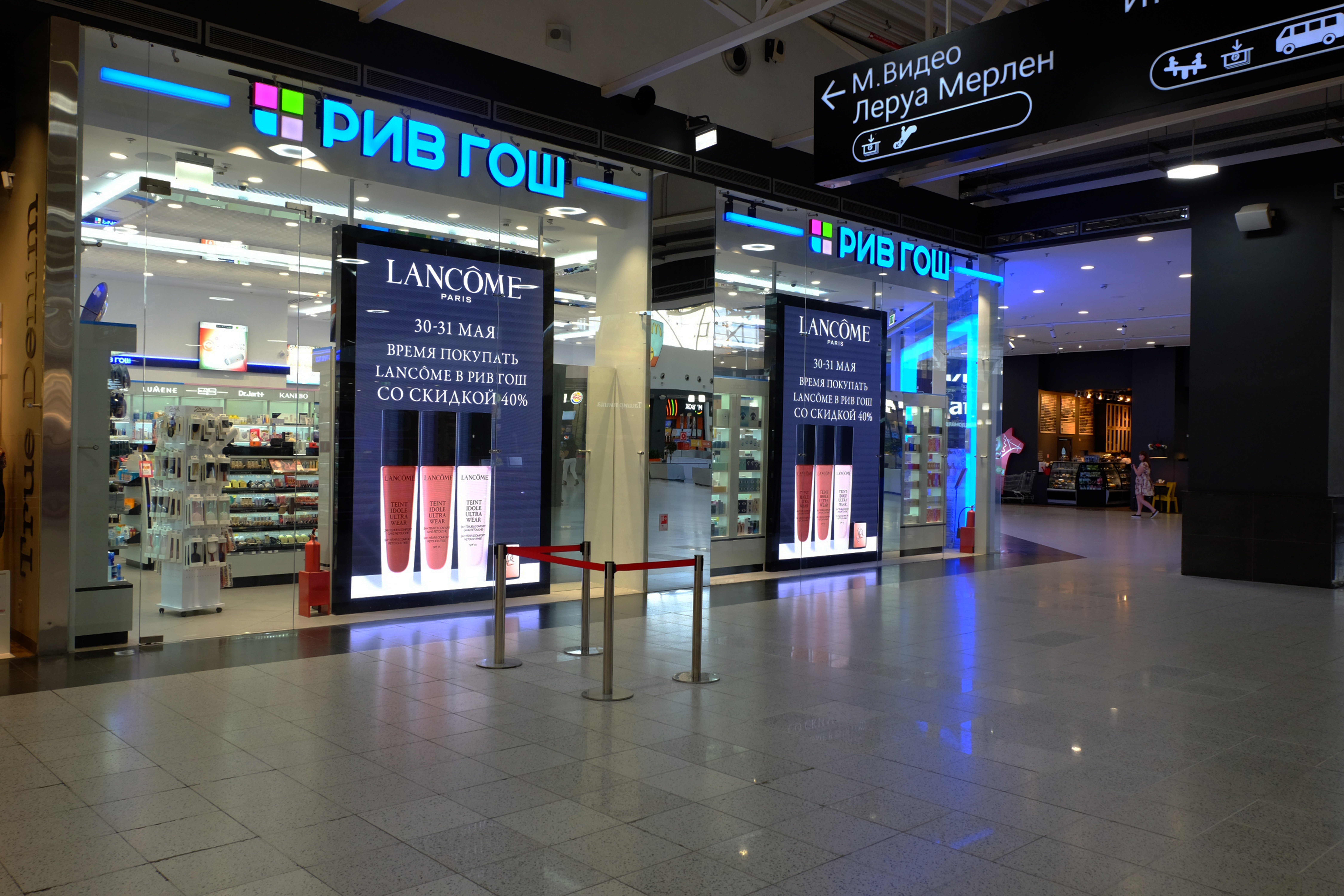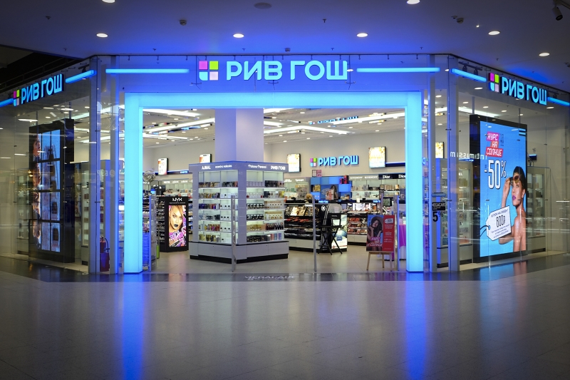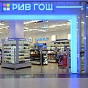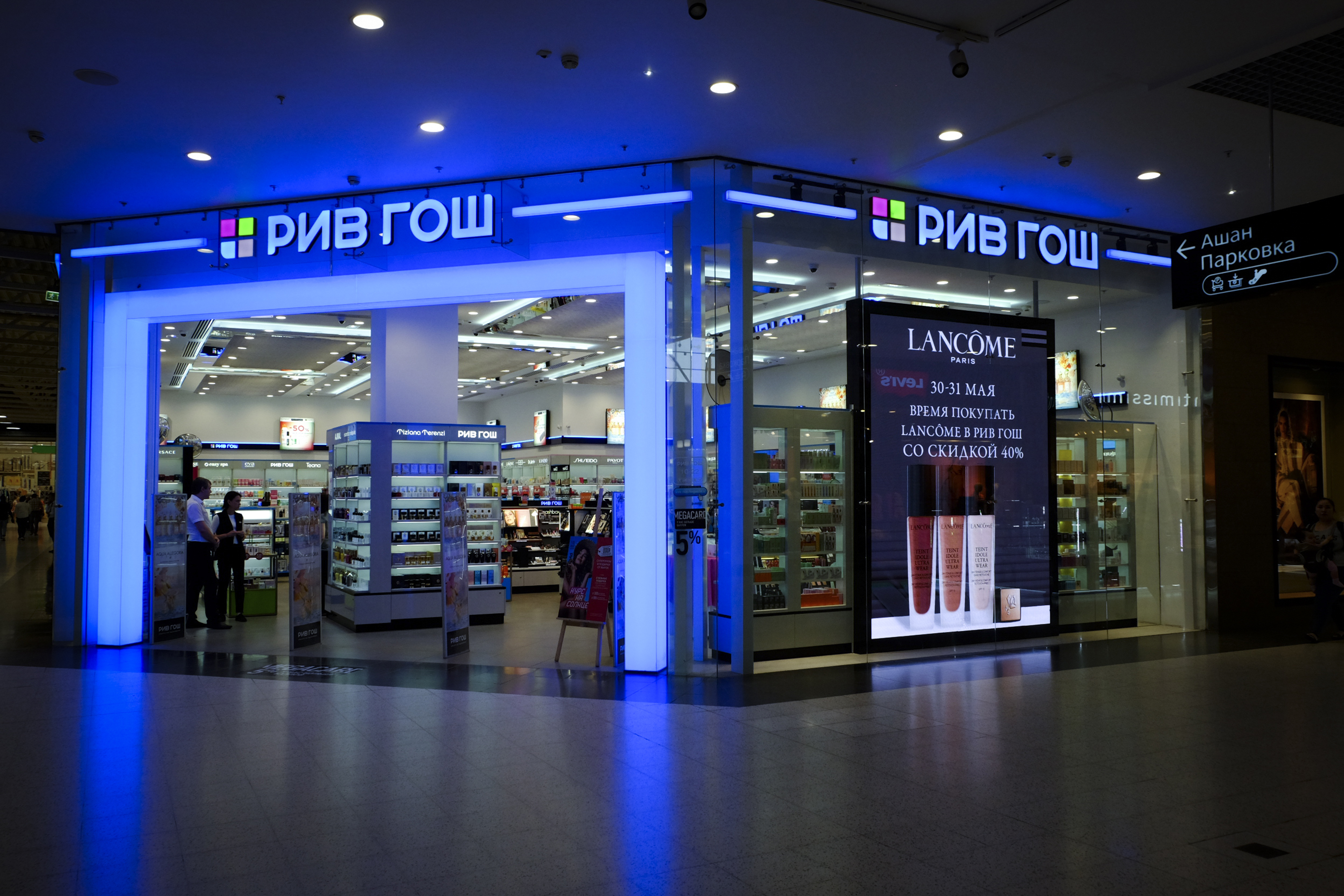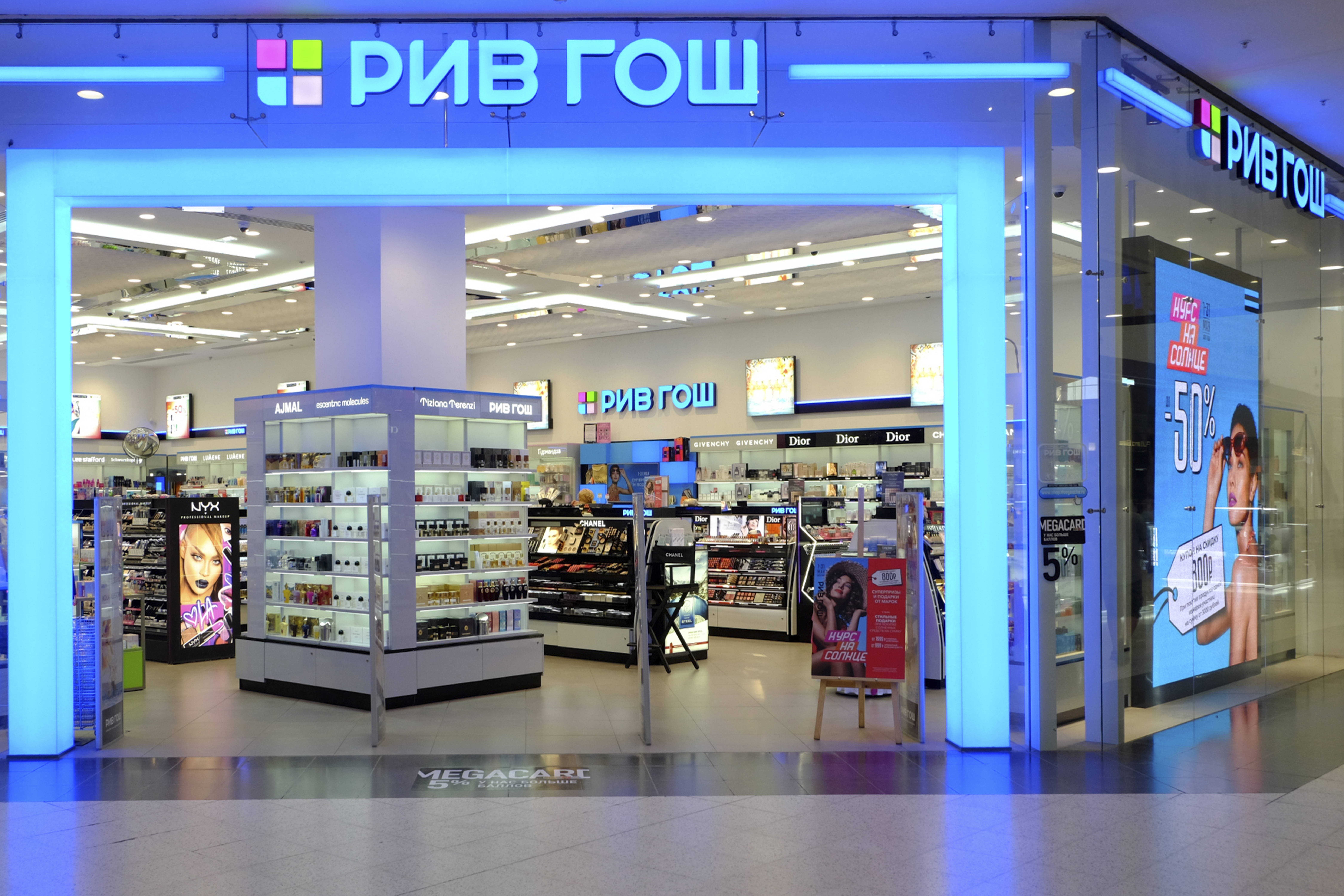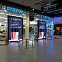 Входная группа состояла из зеркальных колонн, световых порталов и объемных букв. В магазине так же была выполнена закарнизная подсветка и зеркальное обрамление потолка.