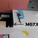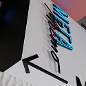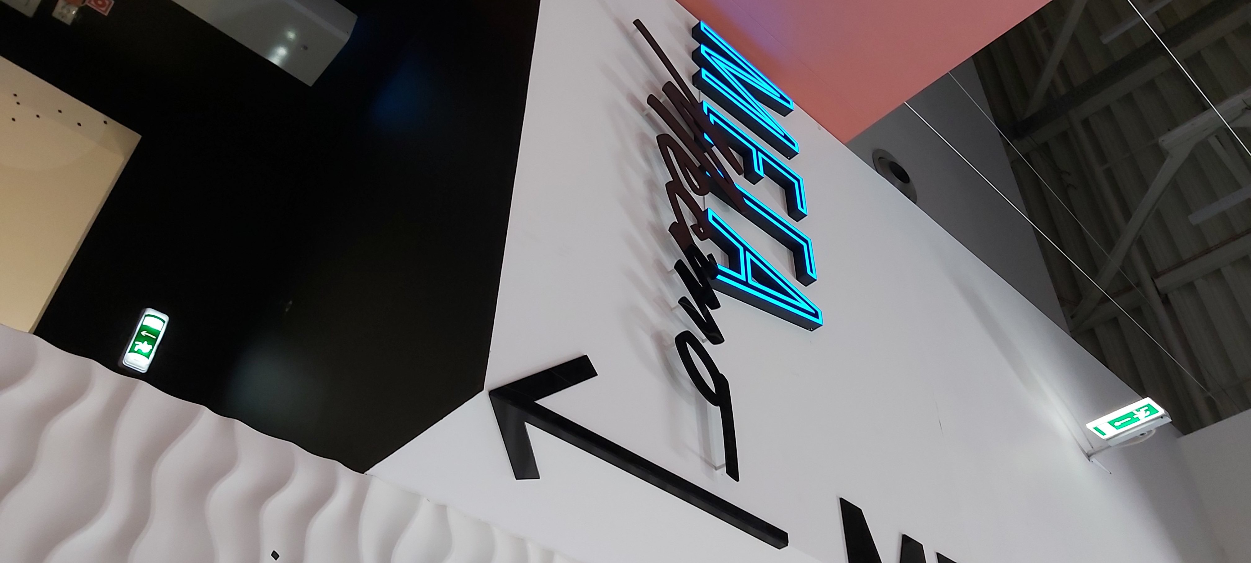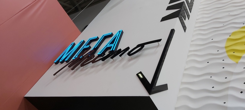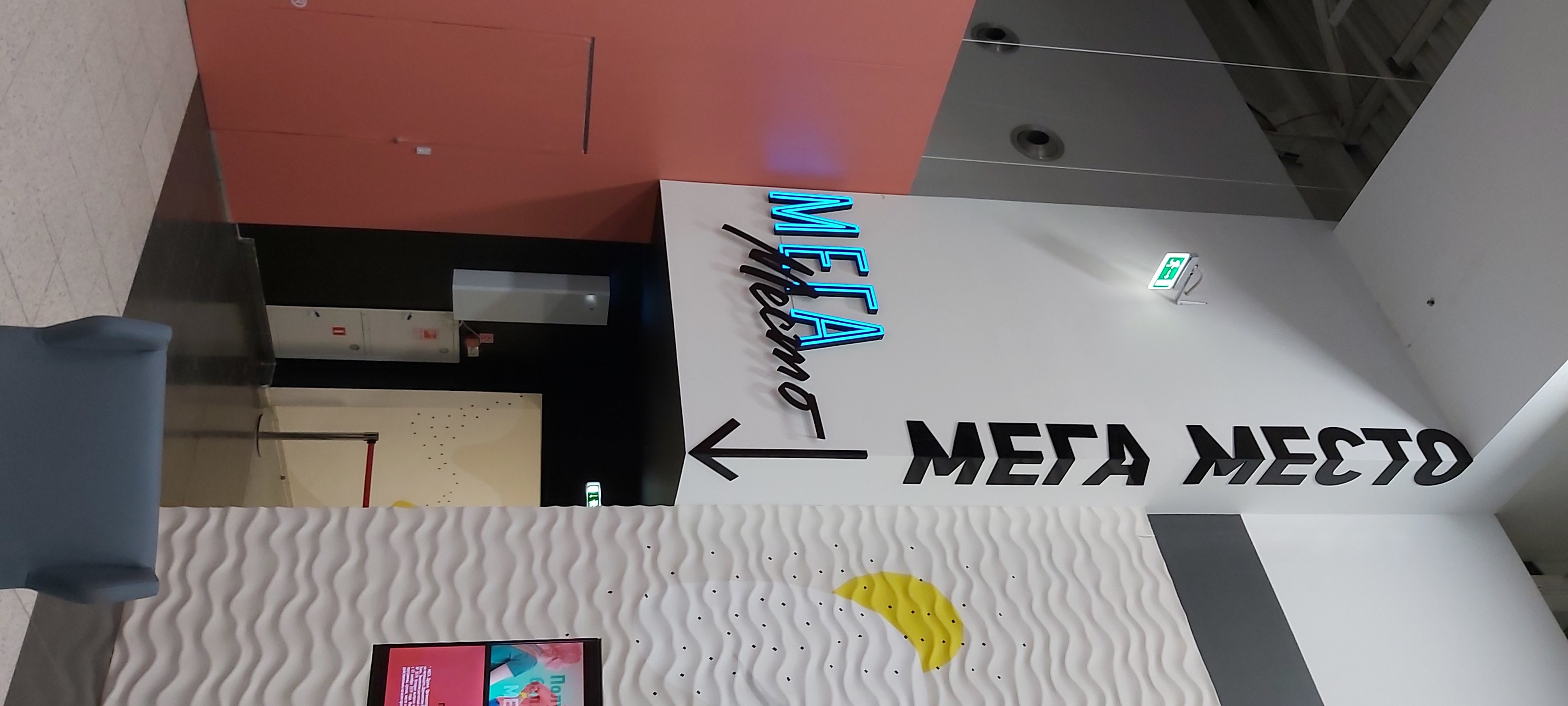 Необходимо было обозначить вход в зону проекта МЕГАместо. Вывеска состоит из объемных световых букв и букв из черного акрила. Особо сложно было разместить световые элементы в надписи МЕГА, так как мета для них там было ОЧЕНЬ мало. Но нас спасла светодиодная лента ELF.