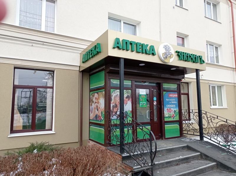 Изготовили козырек входной группы Аптеки. Обшивка композитным материалом фриза и подшивка потолка также композитный материал с установкой светодиодных светильников. Буквы объемные с внутренней подсветкой светодиоды. Оргстекло зеленого цветы. Задник и борт ПХВ окрашены в цвет фронта букв.