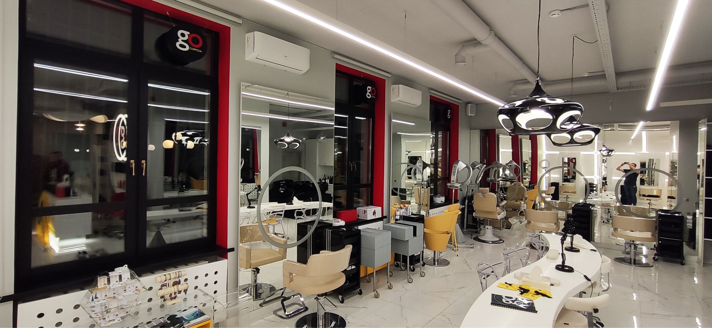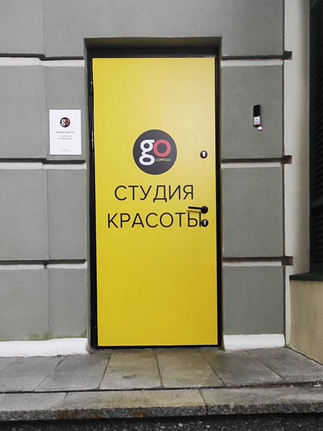 Разработали, изготовили и установили: вывеску на вход, панель-кронштейн, лайтбоксы в окна, логотип на стену, таблички, оформили входную дверь. Акриловое черное стекло в логотипе инкрустировано заподлицо белым акрилом.