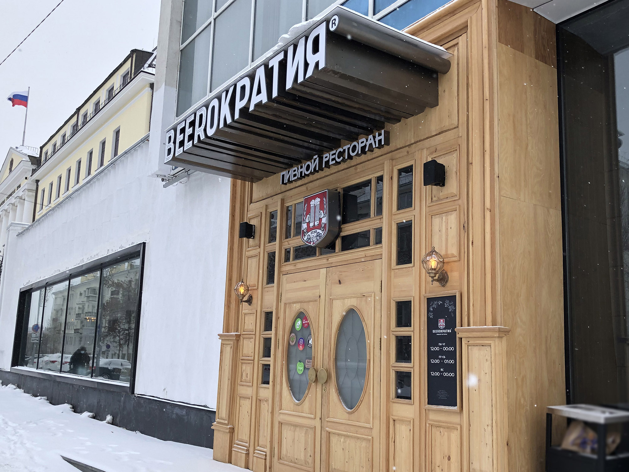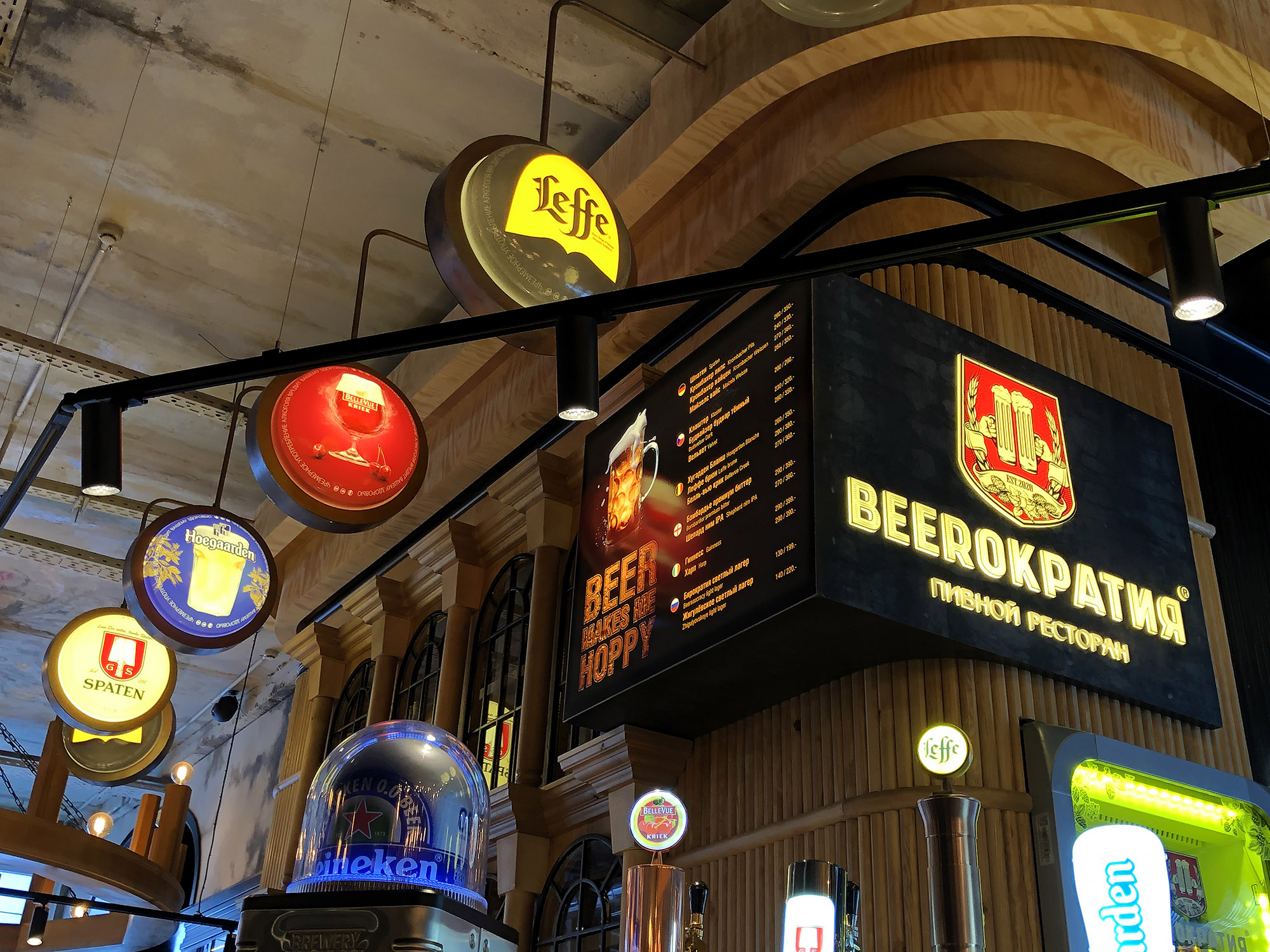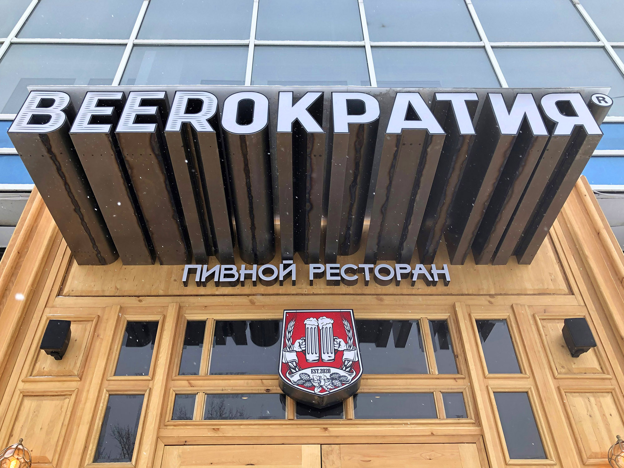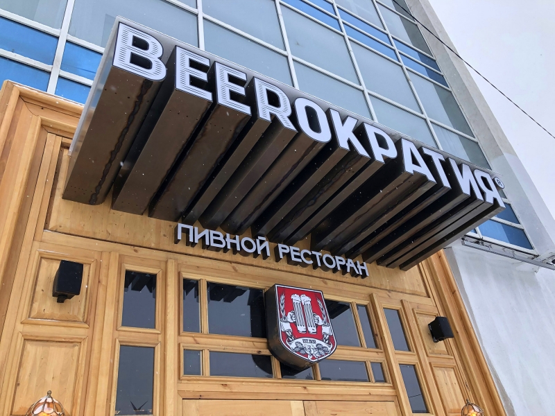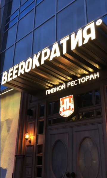РПК «ПАРУС» было выполнено как комплексное наружное оформление фасада для ресторана «BEERОКРАТИЯ», так и интерьерное, по техническому заданию заказчика. Данная работа приложена как демонстрация возможностей компании.