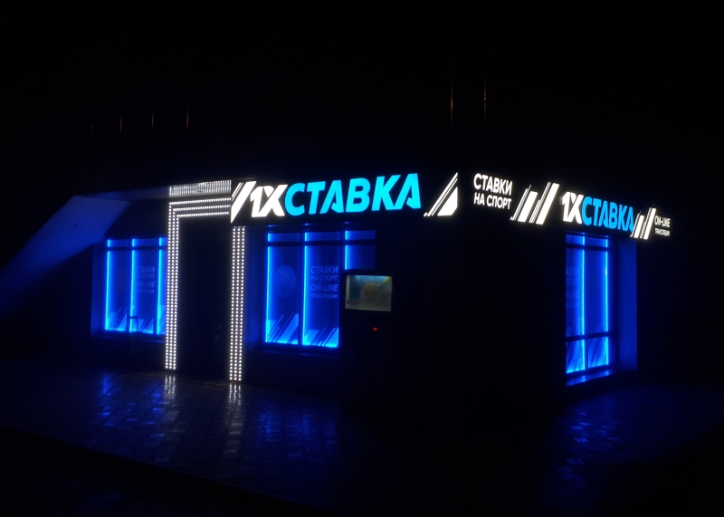 Входная группа, вывеска, ростовые фигуры с подсветкой, роллерные шторы с подсветкой по периметру.