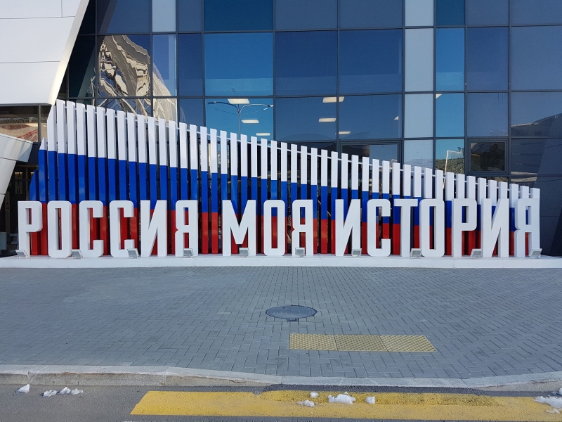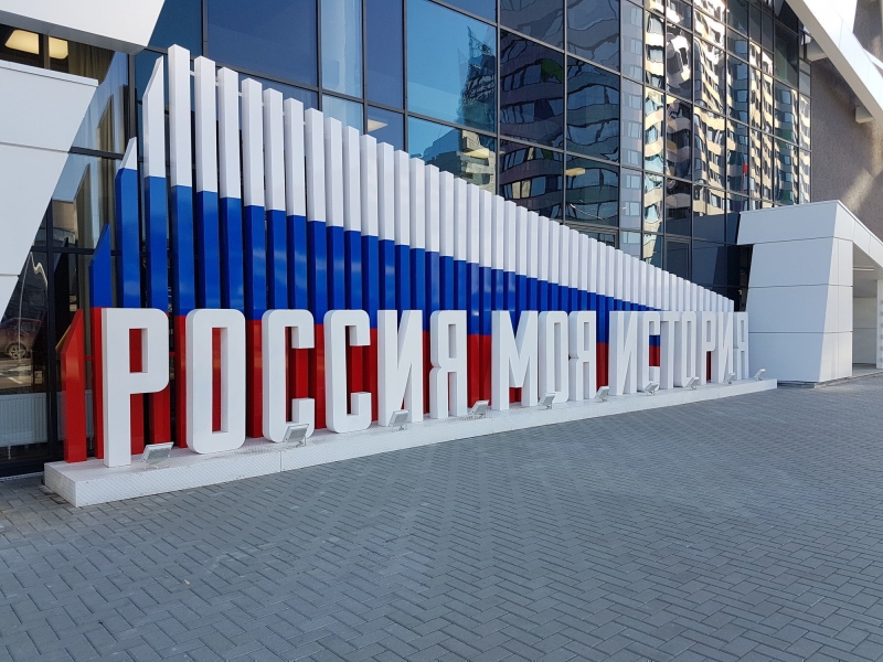 Напольная конструкция состоит из нескольких частей, изготовленных из стали, что придает проекту целостность и особую мощь. Первая часть в виде подиума размером 13,3м в длину и 1м в высоту является основой для букв и колонн. Она изготовлена из стальной профильной трубы, обшитой рифленым листом 3мм и выкрашенной порошковой краской в 3 слоя. Вторая часть – непосредственно буквы "Россия моя история", они изготовлены из стального листа 3мм с покрытием порошковой окраской в 3 слоя и достигают 12,5м х 1,3м. Третья часть представляет собой столбы, символизирующие триколор, располагающиеся за буквами на общем подиуме. Для достижения максимального визуального эффекта всю конструкцию освещаю светодиодные прожекторы в количестве 9шт. Общий габарит всей конструкции составляет 12,9м х 4,1м.