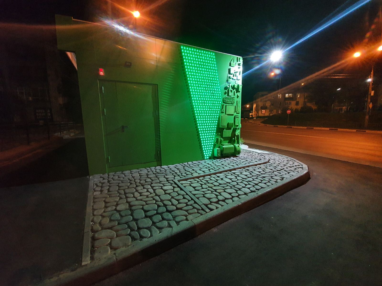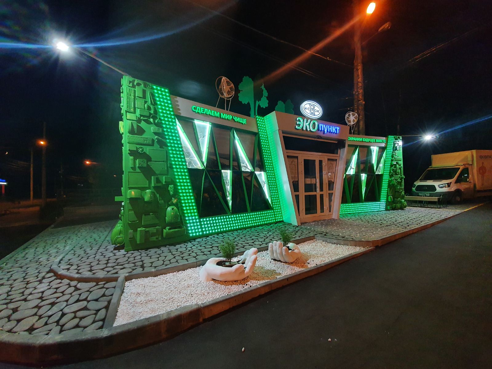 Эко-пункт является подарком горожанам на 800-летия Нижнего Новгорода. Главное отличие нового павильона в том, что он изначально задумывался и реализовывался, как арт-объект. Для его отделки и частичного оснащения использовалось вторсырье - старые элементы техники, бутылки из которых использовали донышки и другие предметы, сданные на переработку.Так, например, нижегородцы, сдавшие свою старую технику, могли увидеть ее в качестве украшения фасада. Подсветка запрограммирована на несколько сценариев под разные события и праздники. Внутри эко-пункта также была создана целая композиция из стекла, пластика и элементов старой техники