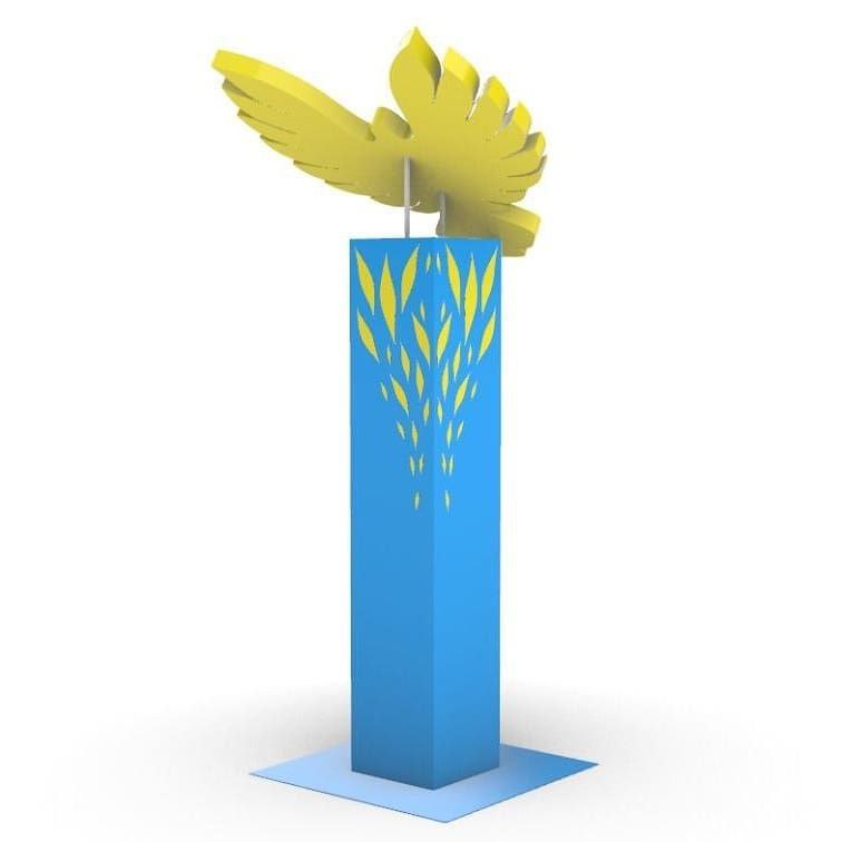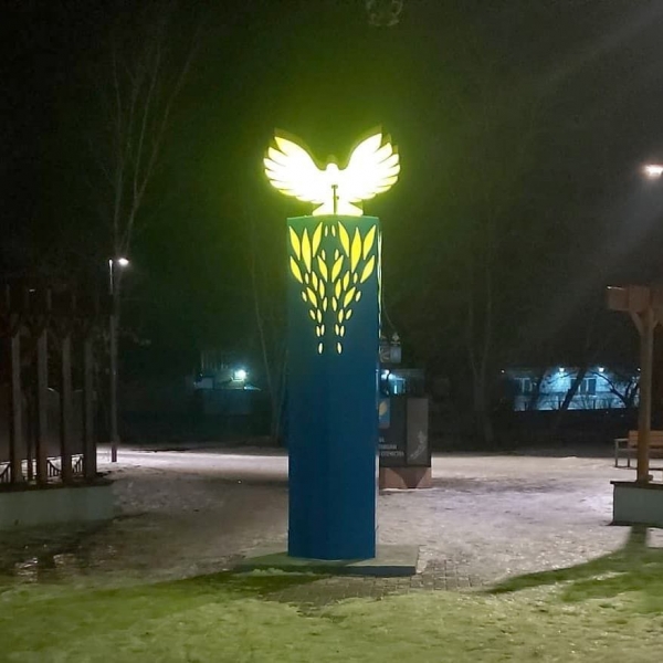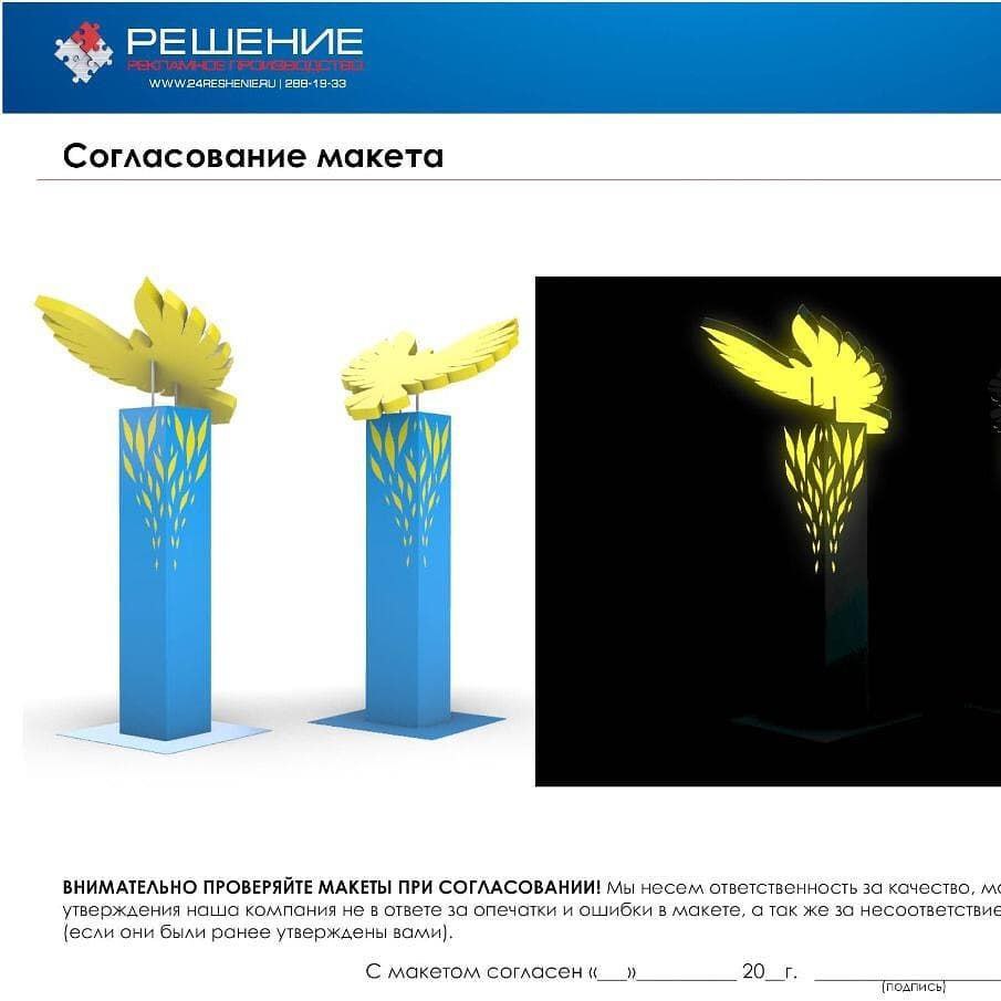 И началась круглосуточная работа дизайнерского отдела – совместить в двухметровой стеле символизм целого района. Первым же согласованием было одобрено изготовление герба – в голубых просторах парит золотая птица, с распростертыми крыльями, от которых исходит солнечный свет. Отлично. Дело за конструкторами. Продуманная технология световой, практически по всей поверхности, стелы; металлоконструкция, обеспечивающая жесткость, антивандальность; способ потайного подключения электричества и много-много рабочих нюансов.