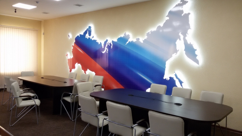 Изготовление и монтаж интерьерной вывески с контражурной подсветкой в виде карты России для пресс-цента телеканала ТРК "Крым"