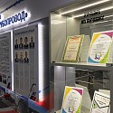 Мы предложили оригинальную идею – обыграть при оформлении стенда тему трубопровода через форму и свет. В связи с этим мы сконструировали боковые зеркальные шкафы так, что при фронтальном взгляде на них заметны линии изгиба трубопровода. С помощью вставок из прозрачного стекла, зеркал на задних стенках и внутренней подсветки шкафчиков мы смогли равномерно и гармонично распределить декоративную нагрузку бокового оформления, что позволило нам добиться желаемых эффектов восприятия.