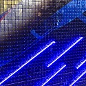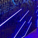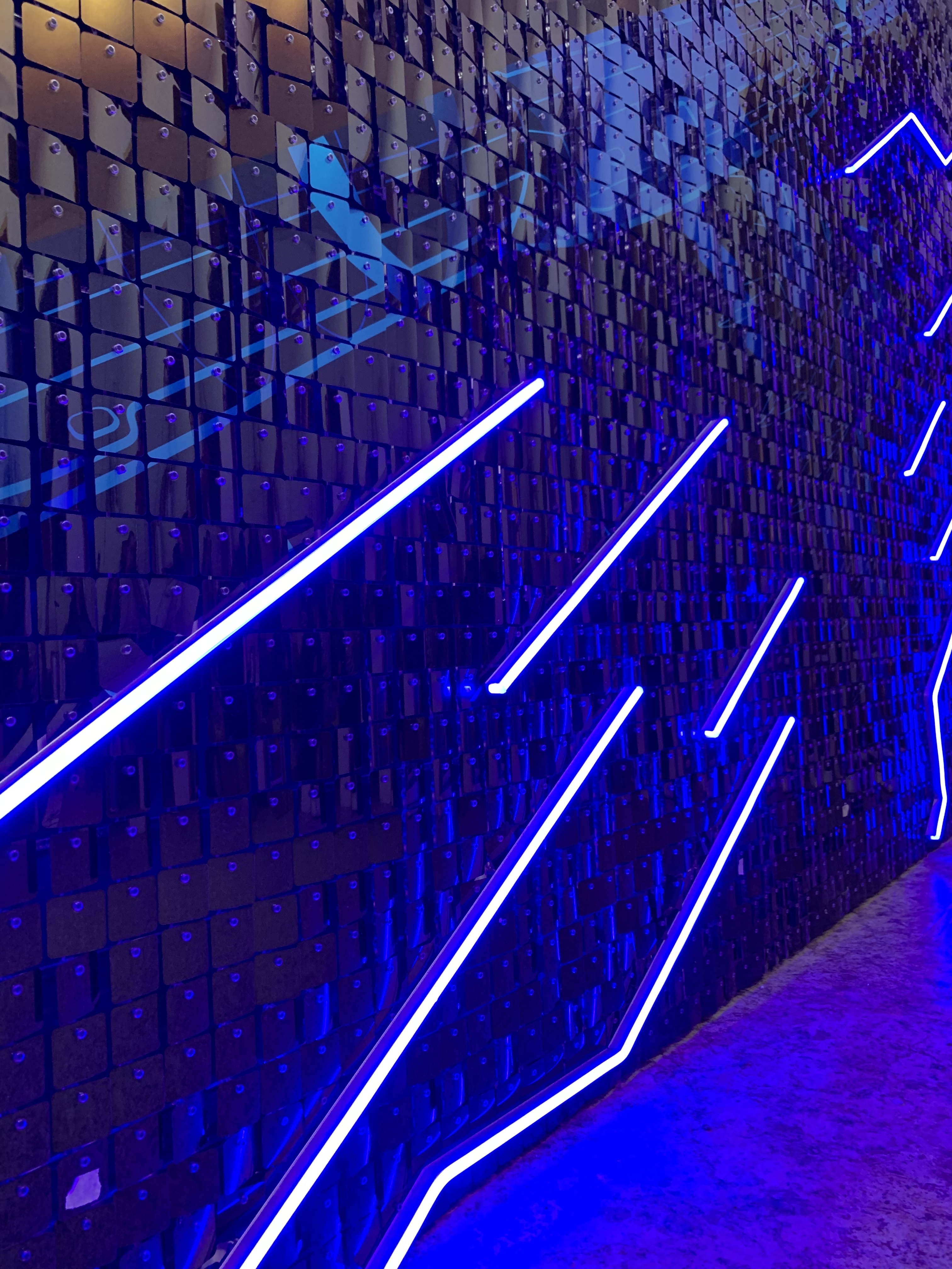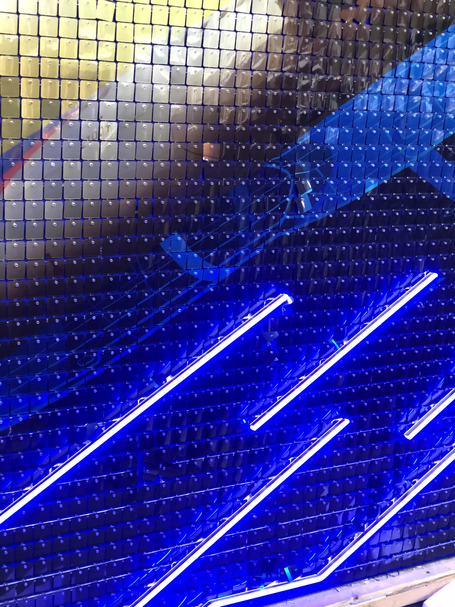Пайетки с фотопечатью на сатиновом металле создают общий технологичный фотон и движение элементов при передвижении людей и движения воздуха. Световые буквы и знак выполненные из жидкого акрила с алюминиевым шлифованным бортом и неоновые элементы подчёркивающие самолётные части изображения создают гармоничную картинку.