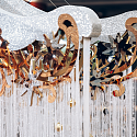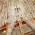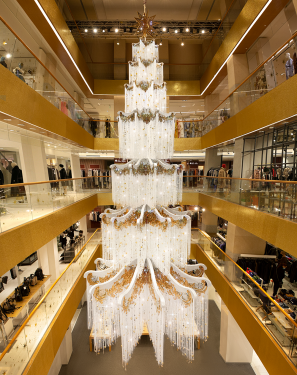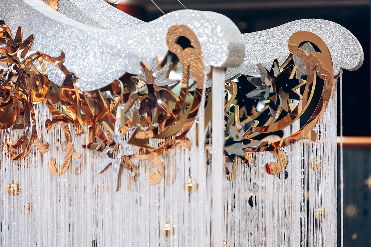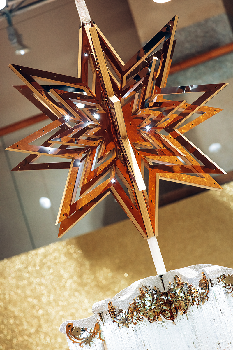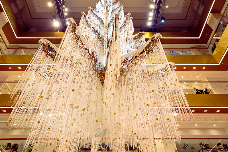 В этом году данный прекрасный обычай Swarovski впервые пришел в Россию. В качестве пространства был выбран атриум ЦУМа, всегда ярко и необычно украшенный праздничным новогодним декором. Воздушная форма елки выполнена из тончайшего золотого кружева веток, покрытых шапкой снега из сверкающего материала. Каждая веточка украшена декоративными серебряными элементами – звездами и месяцем. 2000 новогодних украшений Swarovski, каждое из которых имеет более 200 кристальных граней, мерцают и переливаются, передавая настроение праздника. Елку венчает новогодняя звезда.