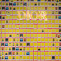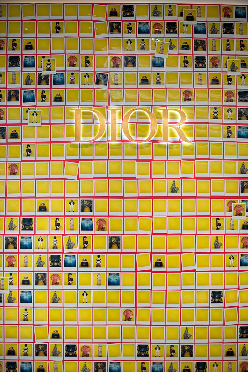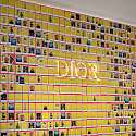 На производстве, в цеху, закрепляли на каркасе по одной фотографии в определенном порядке, чтобы создать композицию из желтых и имиджевых снимков. Логотип выполнен из состаренной латуни, с контражурной подсветкой. DIOR J’adore.