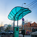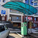 Навес защищает автомобиль и водителя от осадков, является заметным маяком для поиска ЭЗС, а также хорошо вписался в общую стилистику жилого комплекса.