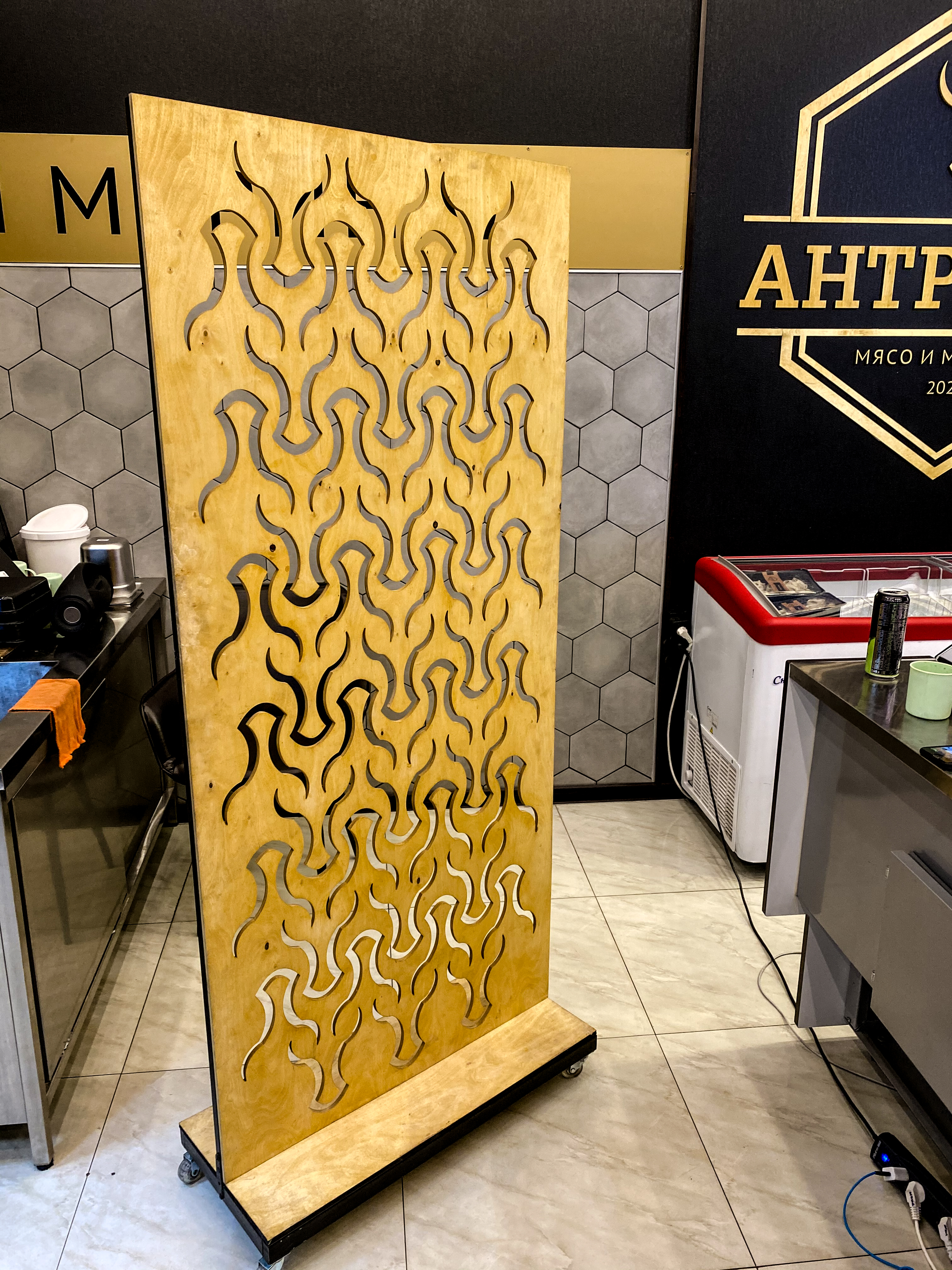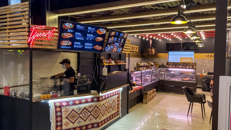 - изготовление фриза из фанеры в гриль-зоне для размещения меню-бордов и неоновой вывески;