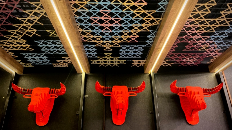 - лазерная резка фанеры (головы быков, логотип компании, указатели продукции, полки для специй, доски с гравировкой);