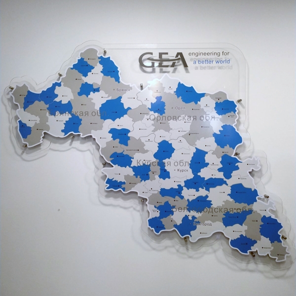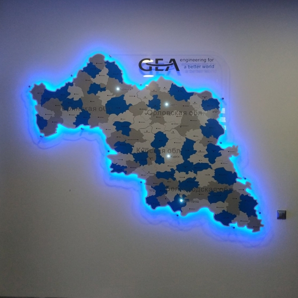 Карта из акрила, с контражурной подсветкой, на дистанционных держателях.