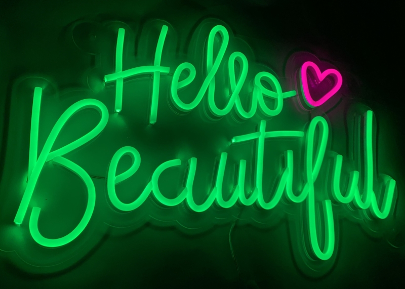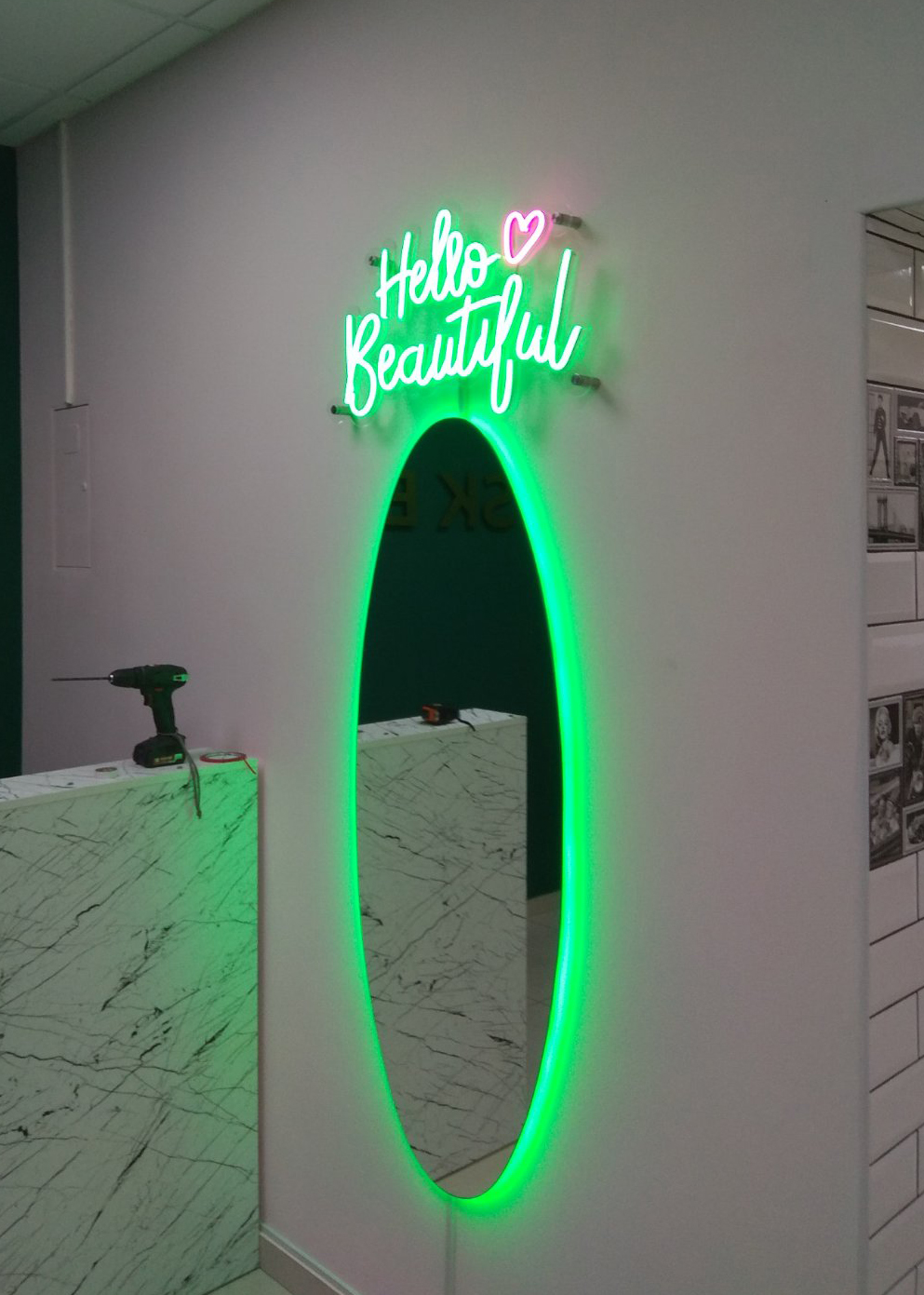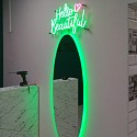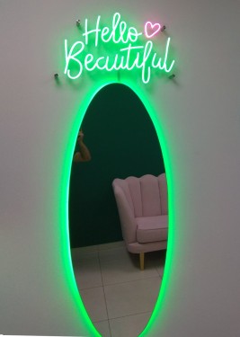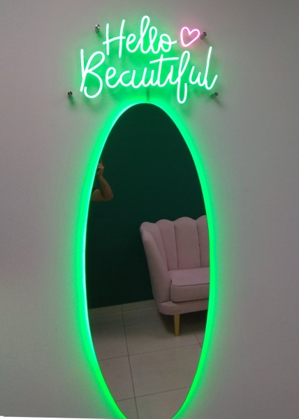 Буквы и подсветка зеркала выполнены из гибкого неона.
