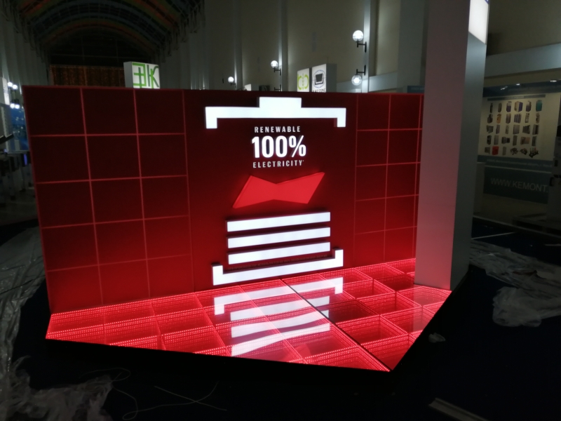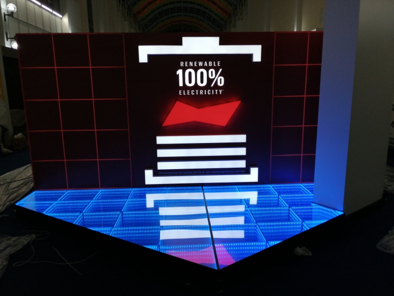Световая инсталяция-стенд для компании ИнБью. Трехмерный пол с изменяемой подсветкой, фасад с контурным и прямым светом